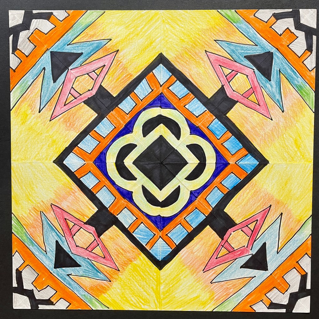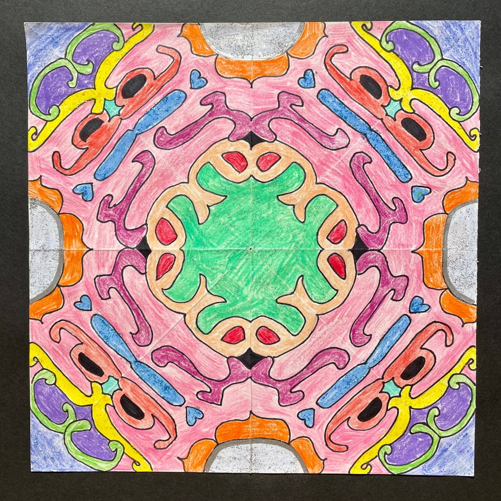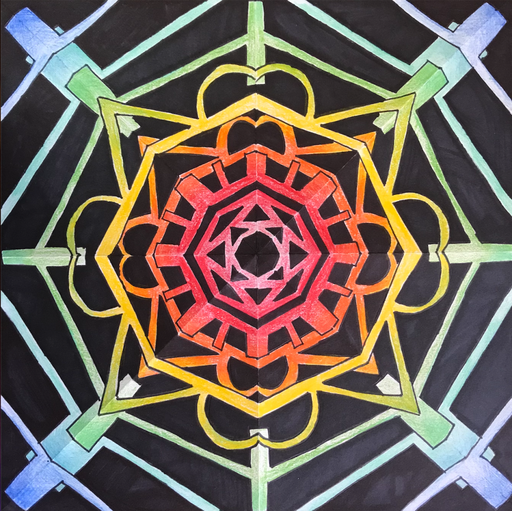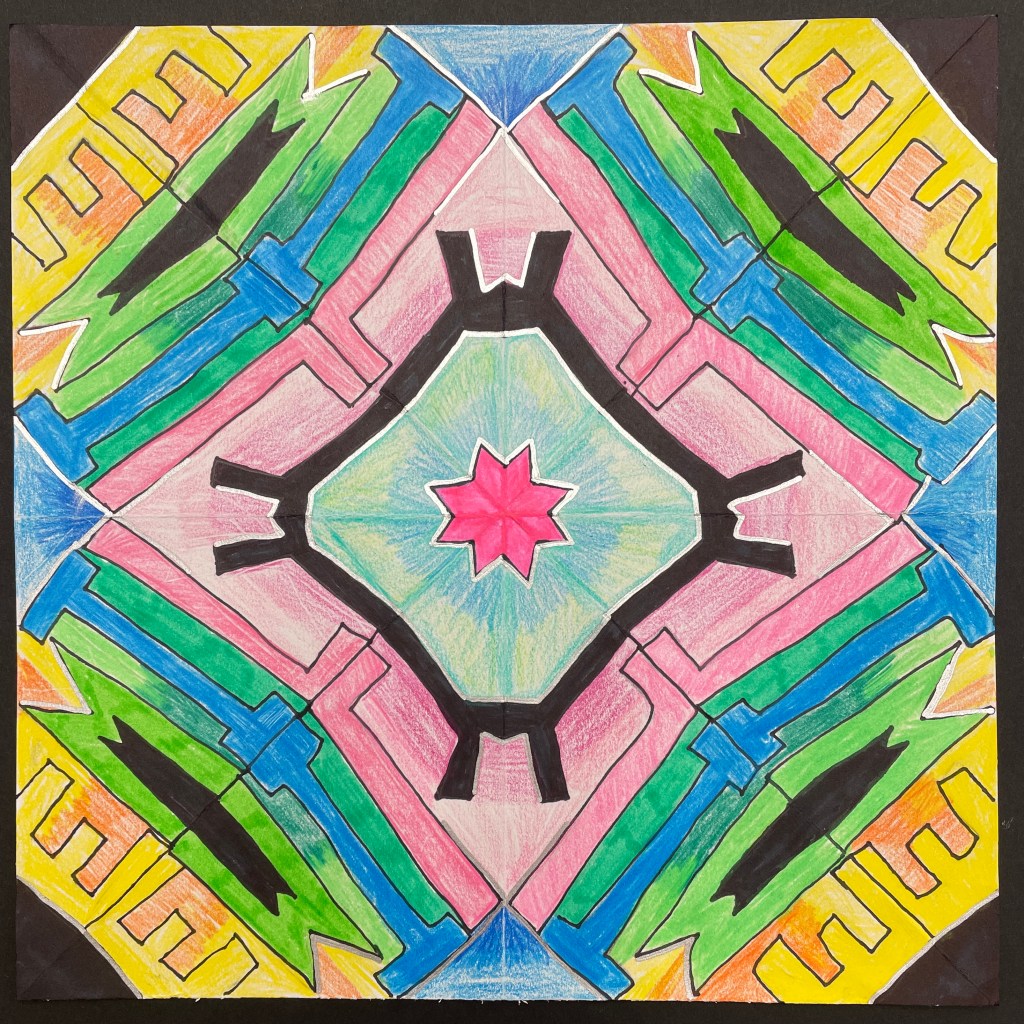 Before coloring their design with their choice of colored pencils, markers, or both, students were encouraged to choose some areas to fill in solid black, which adds an element of strong contrast. The elements of radial symmetry should be preserved as students complete their color work.