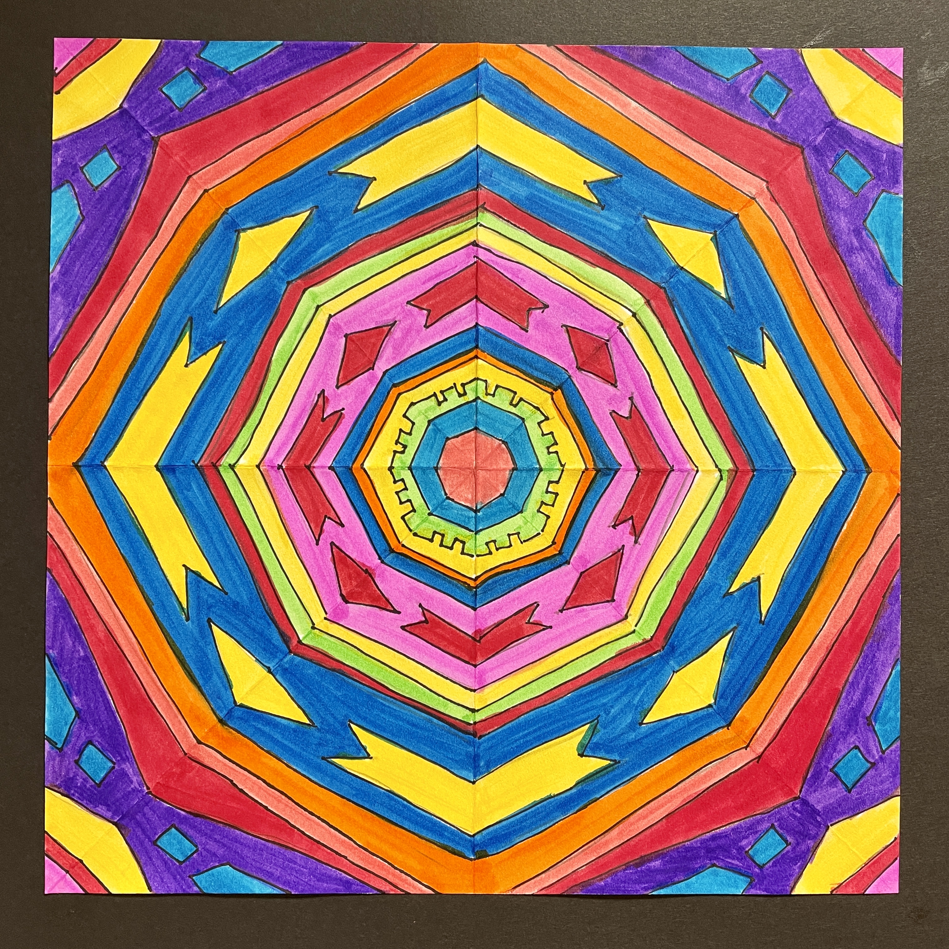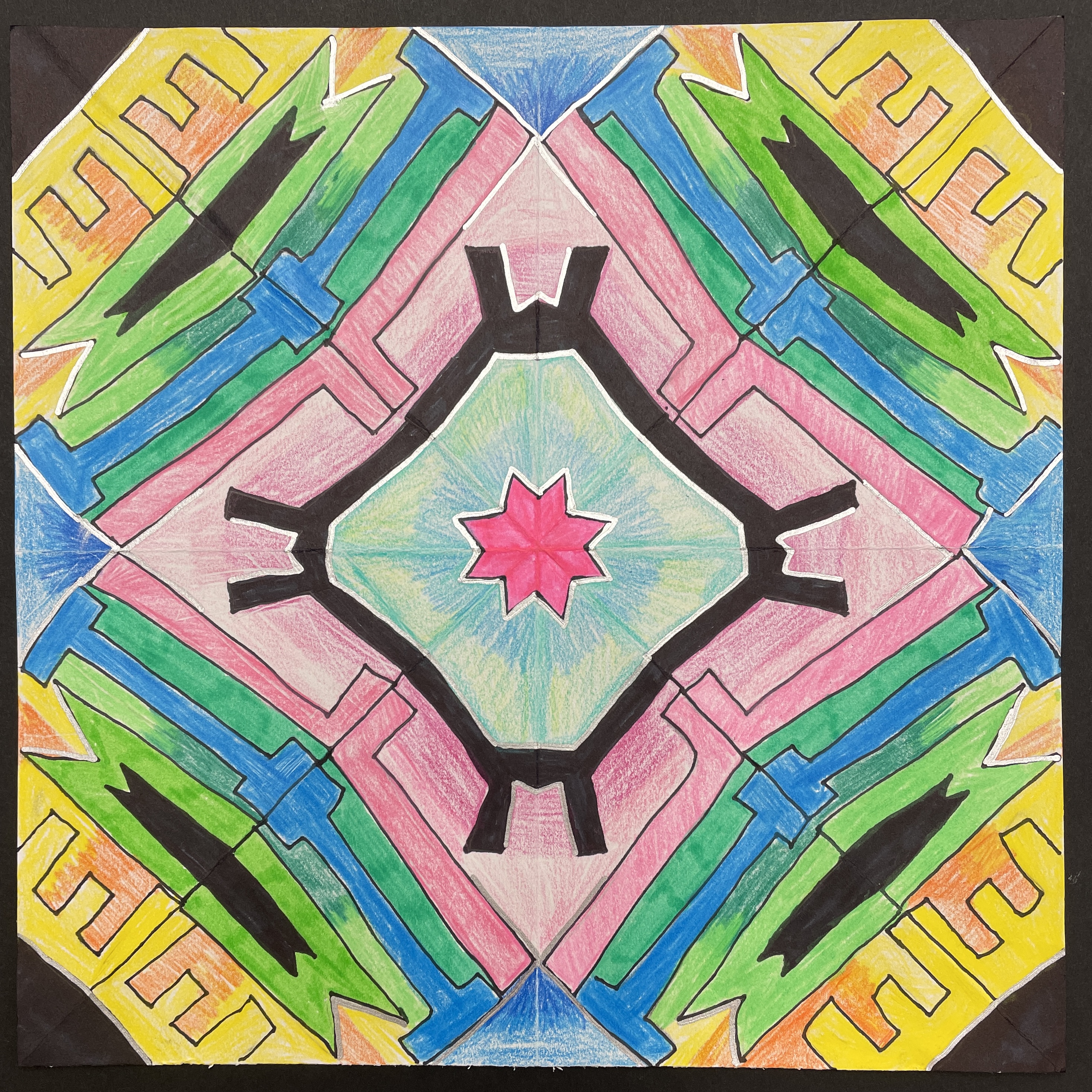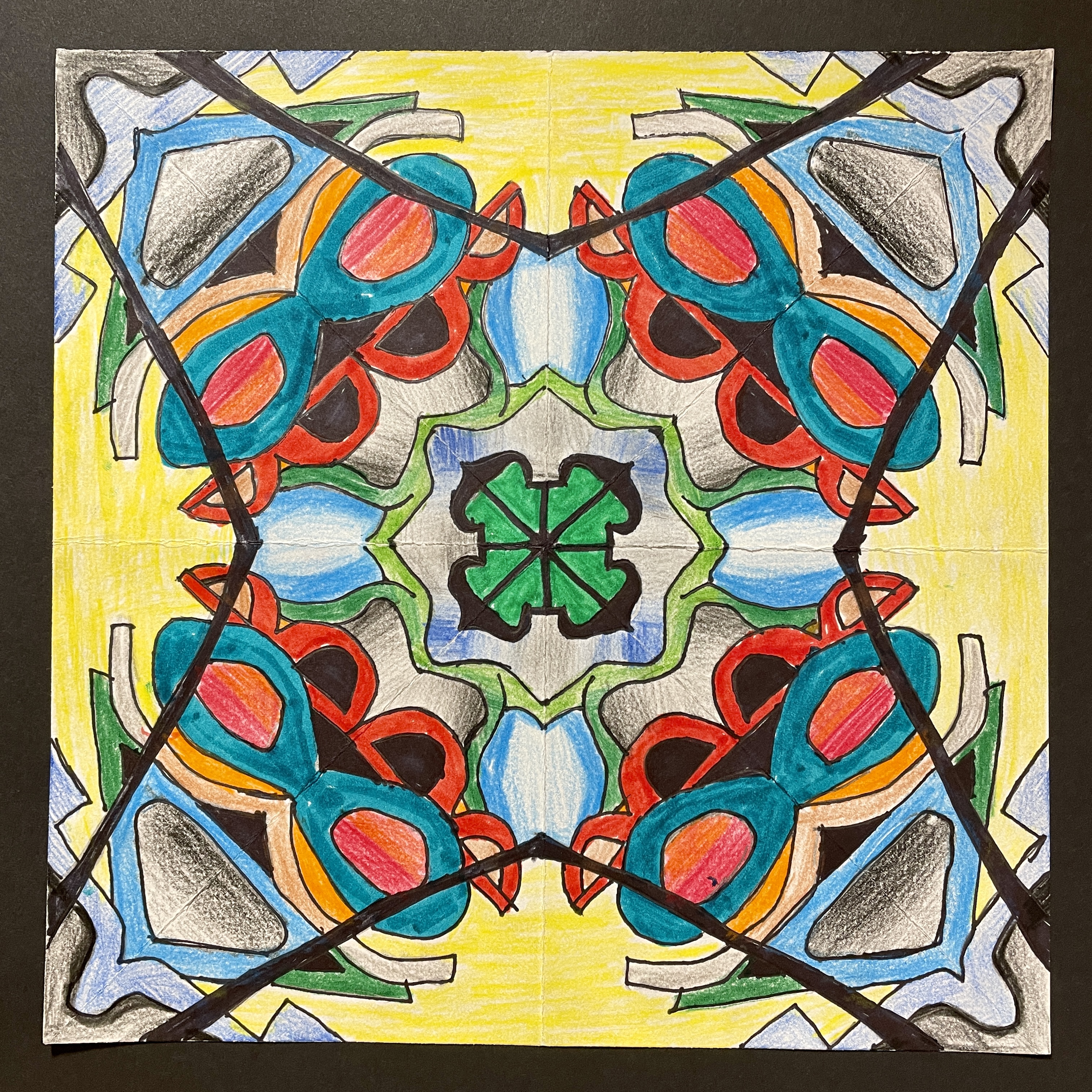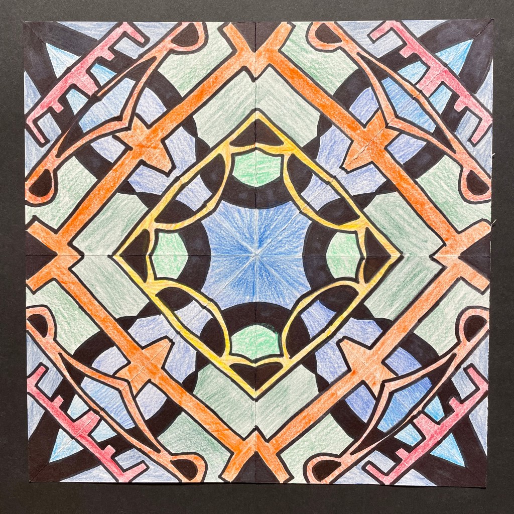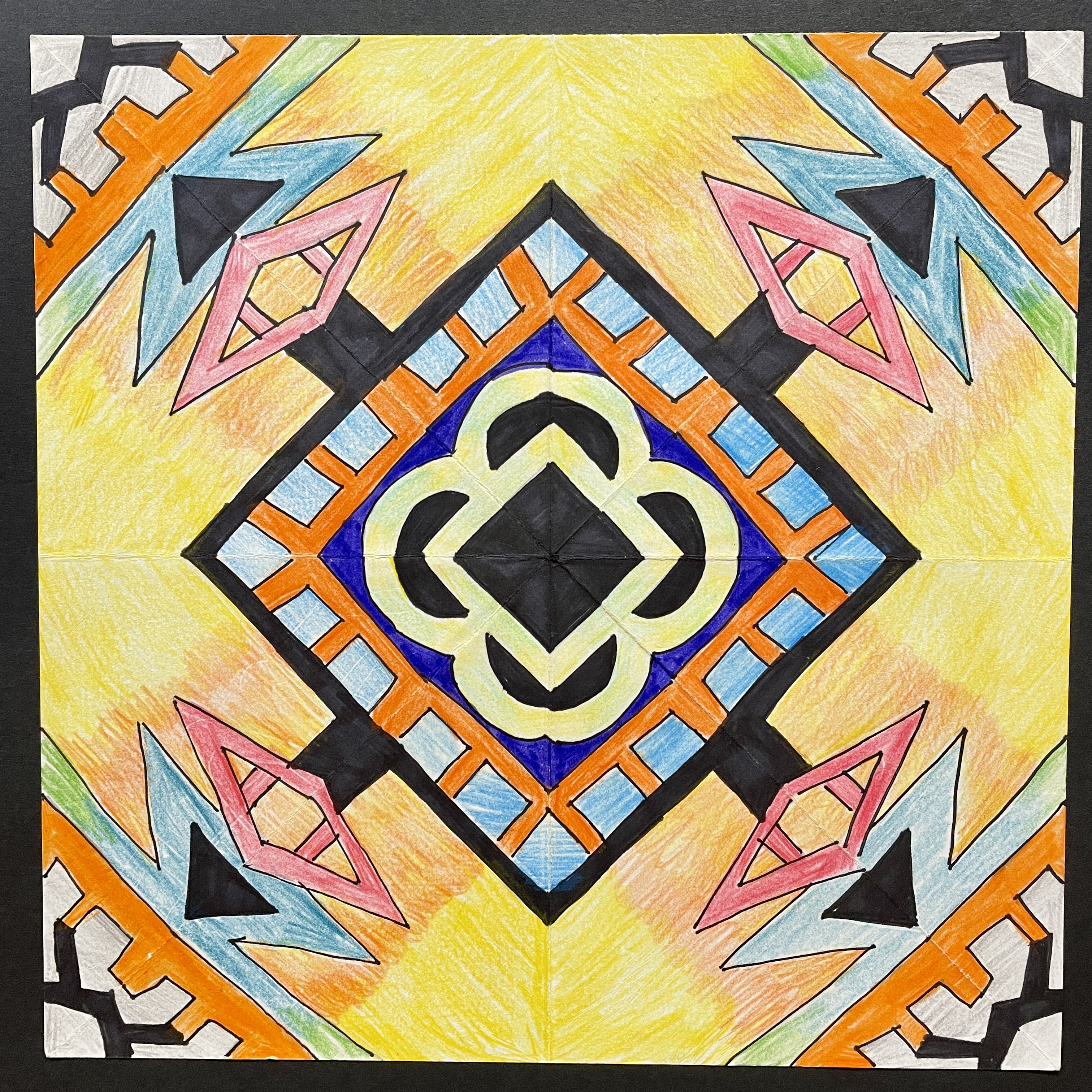Before coloring their design with their choice of colored pencils, markers, or both, students were encouraged to choose some areas to fill in solid black, which adds an element of strong contrast. The elements of radial symmetry should be preserved as students complete their color work.