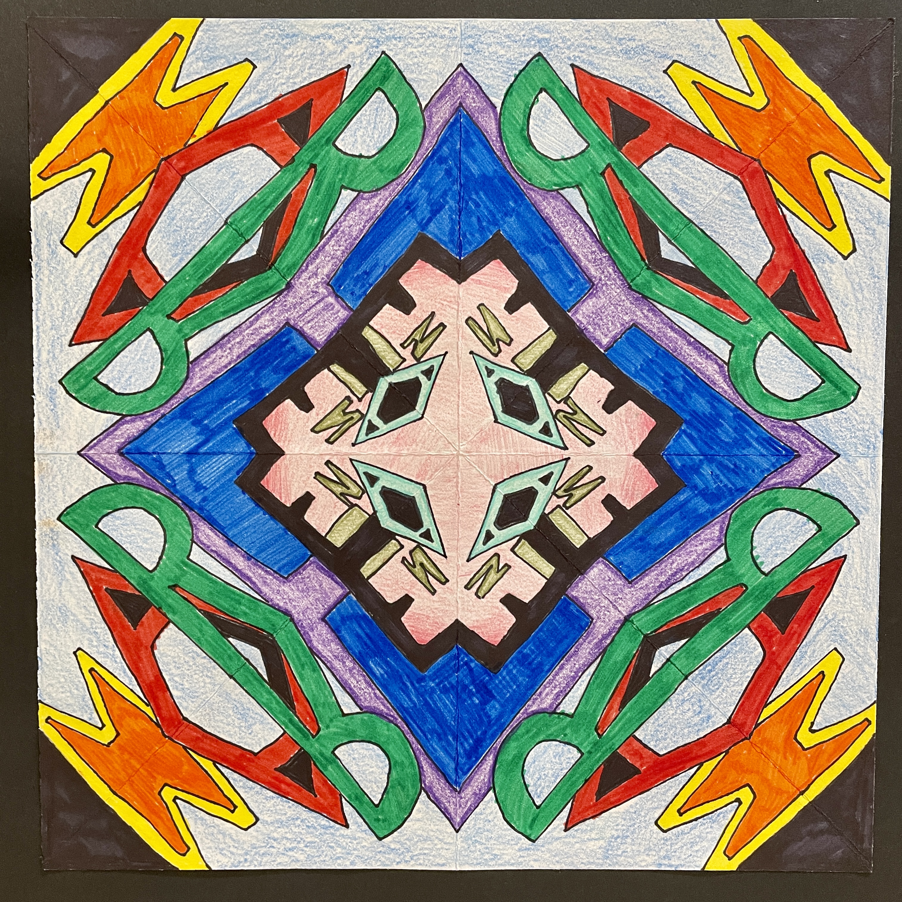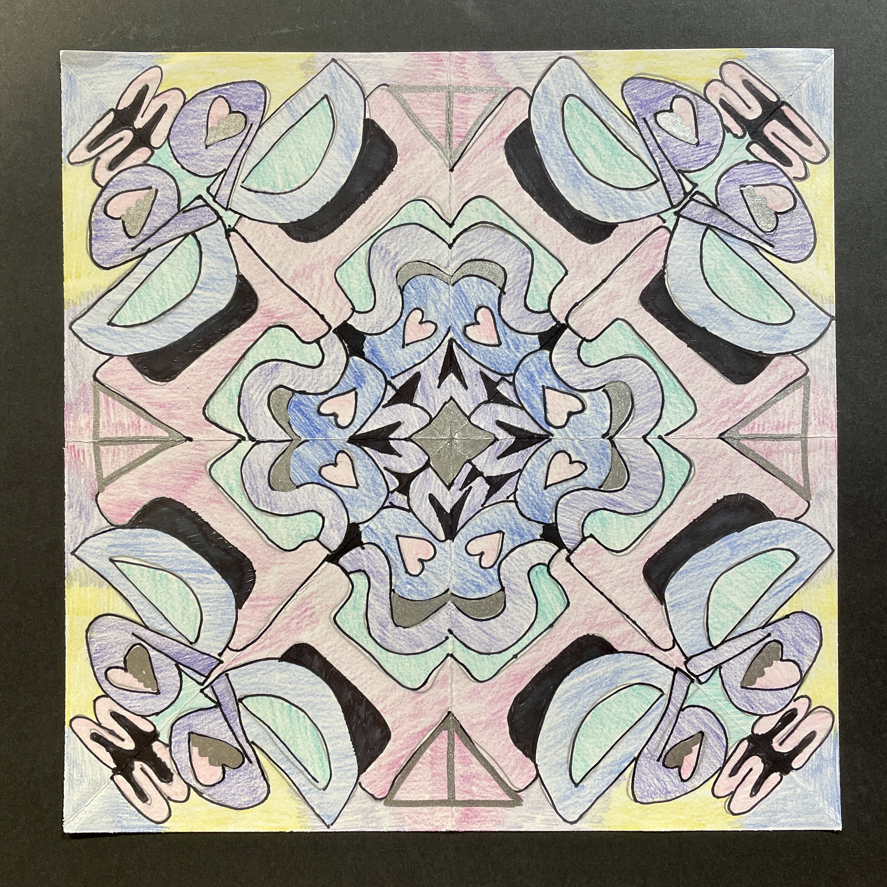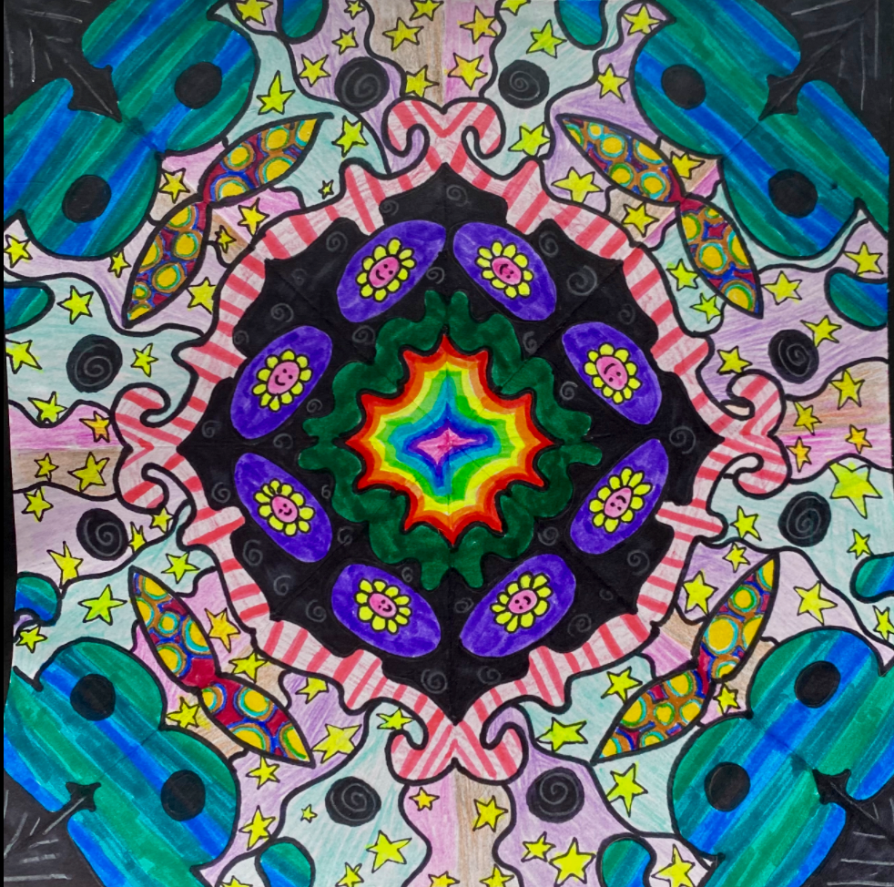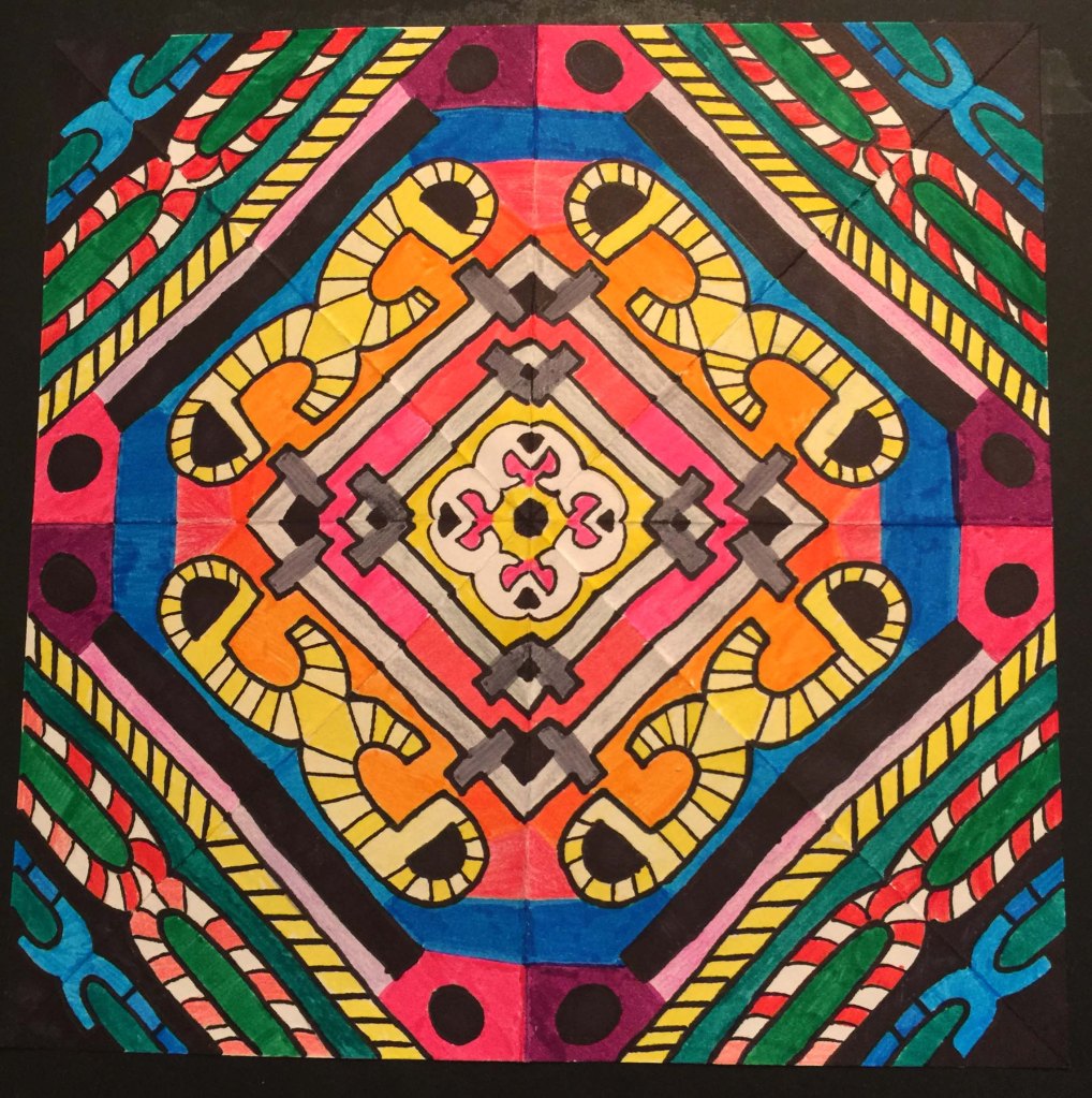 Before coloring their design with their choice of colored pencils, markers, or both, students were encouraged to choose some areas to fill in solid black, which adds an element of strong contrast. The elements of radial symmetry should be preserved as students complete their color work.