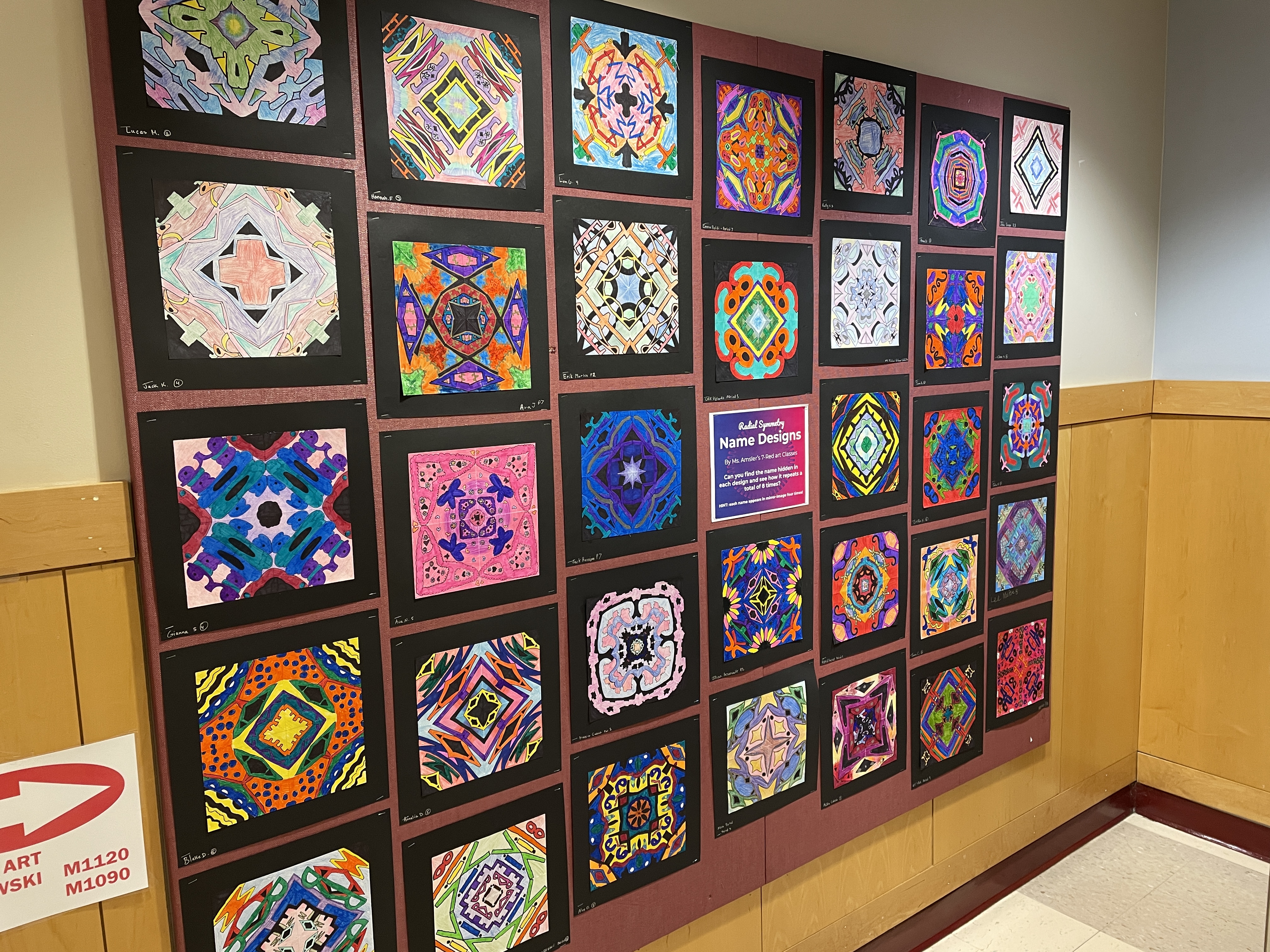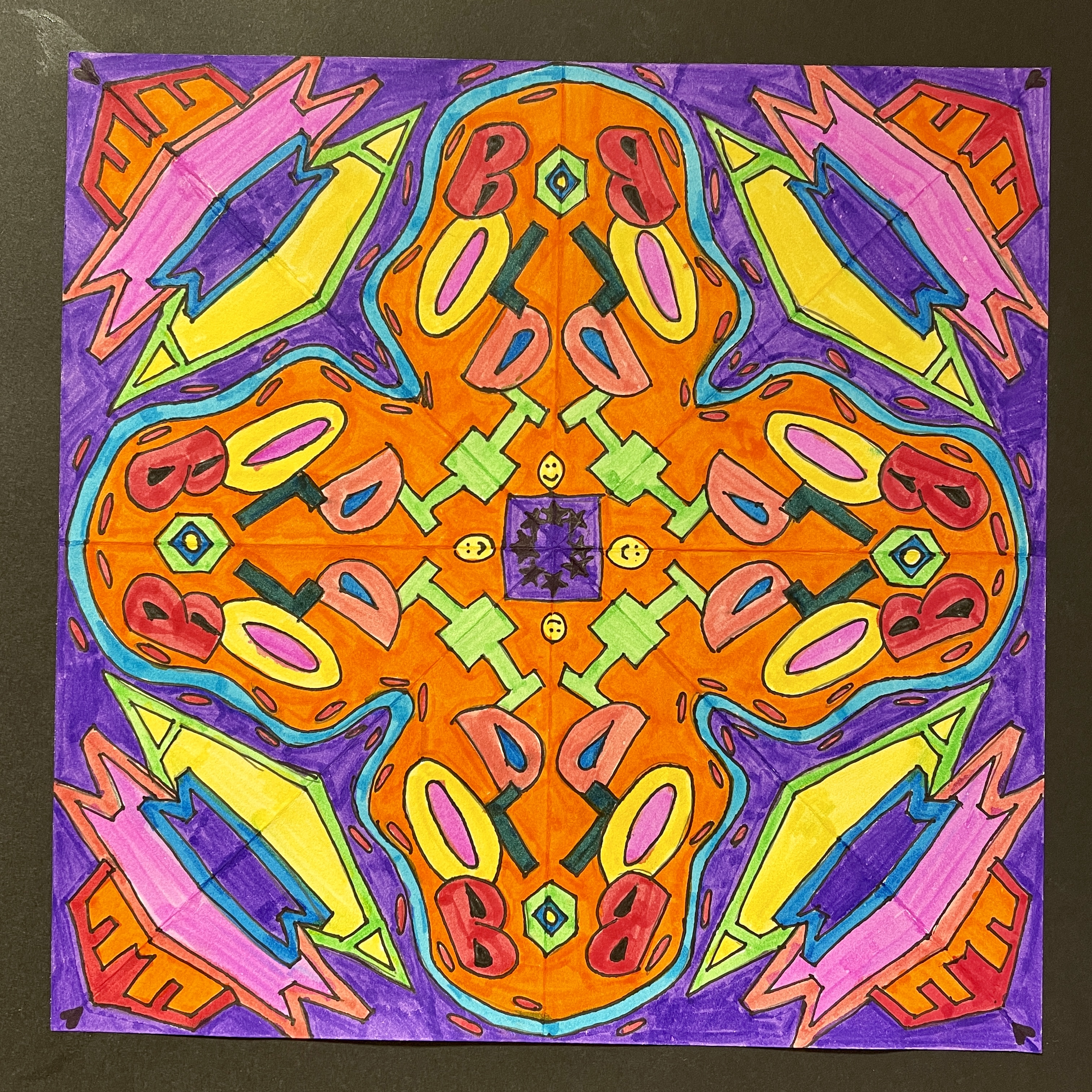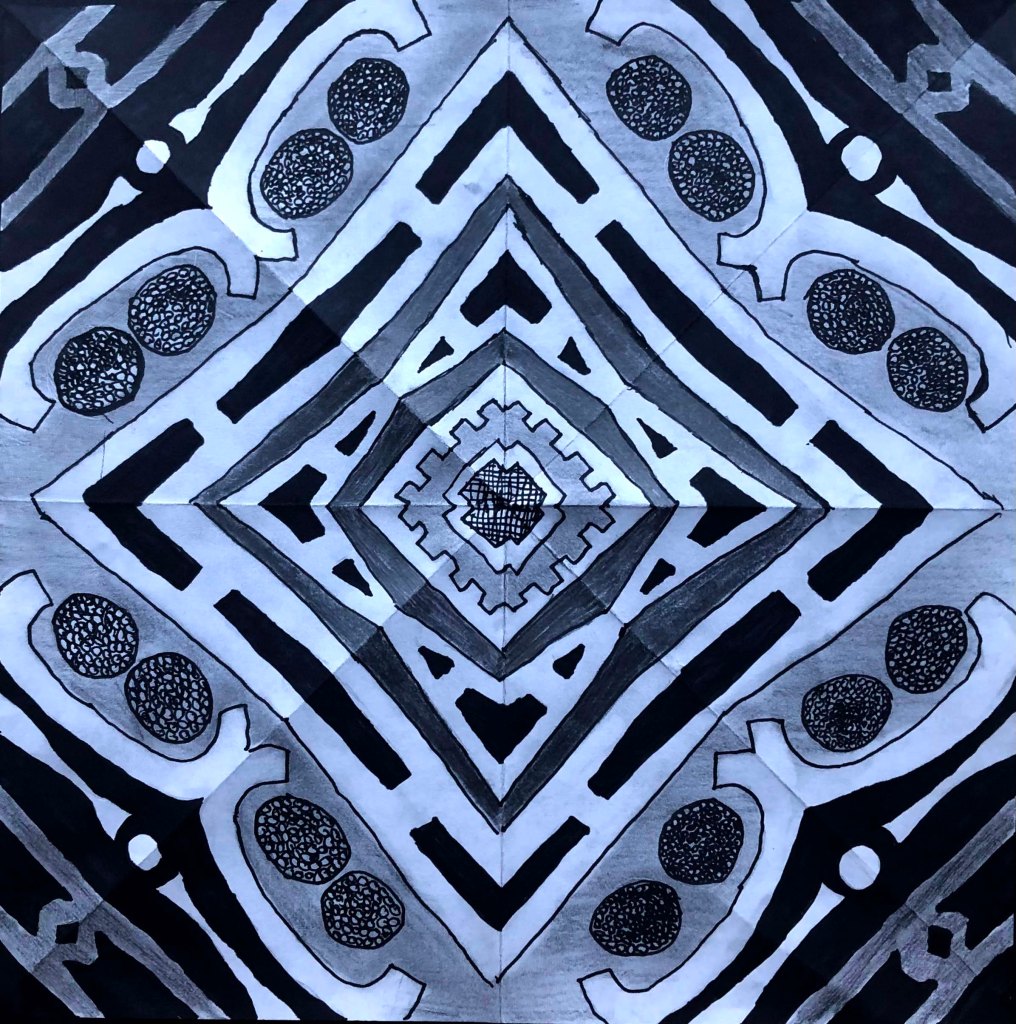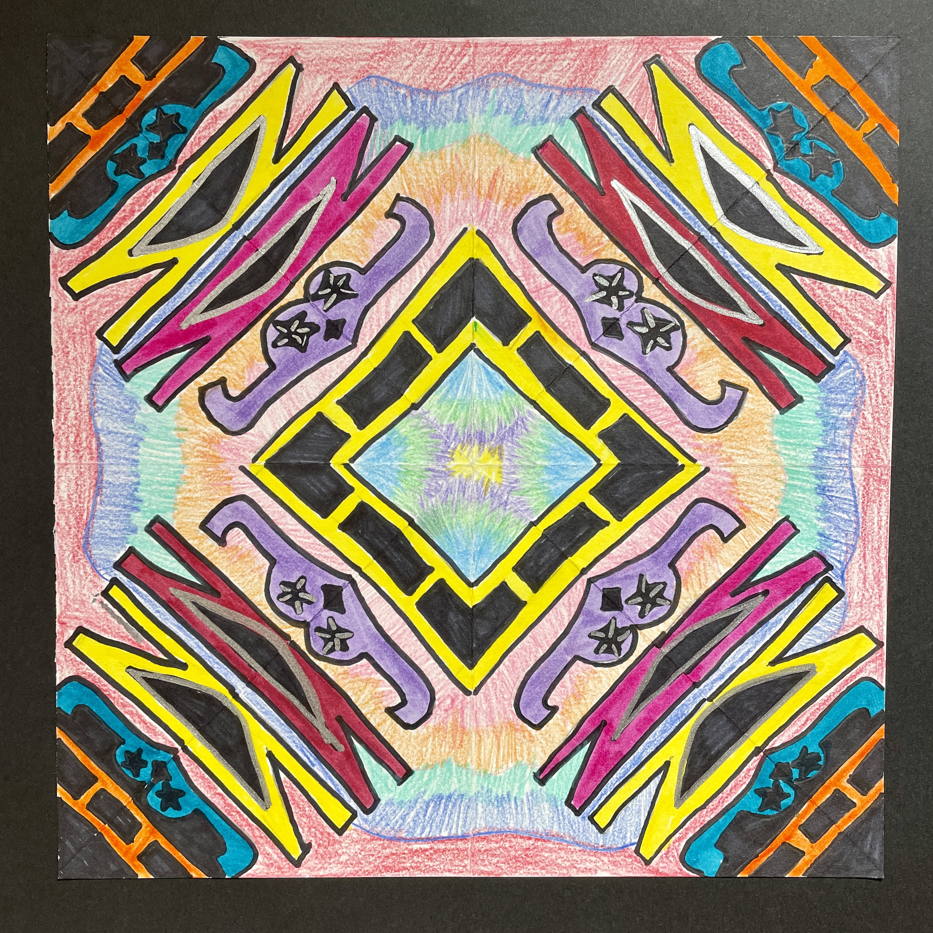 Before coloring their design with their choice of colored pencils, markers, or both, students were encouraged to choose some areas to fill in solid black, which adds an element of strong contrast. The elements of radial symmetry should be preserved as students complete their color work.