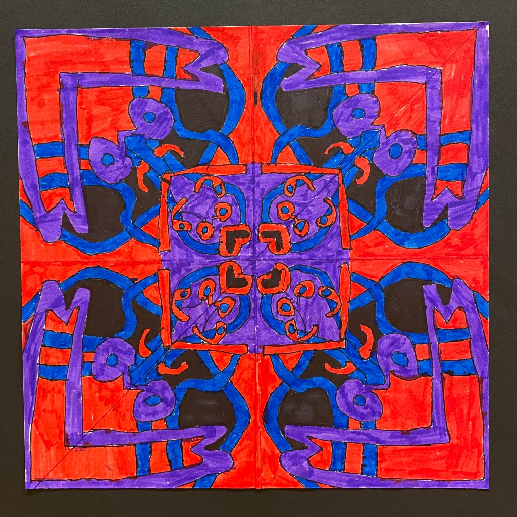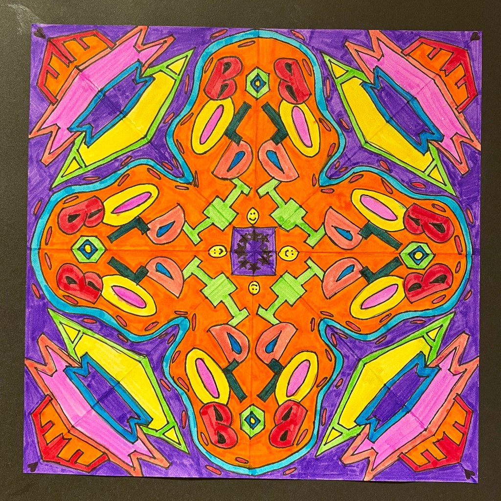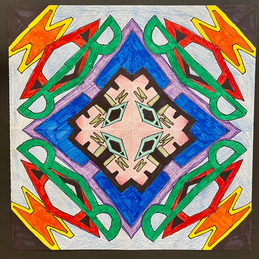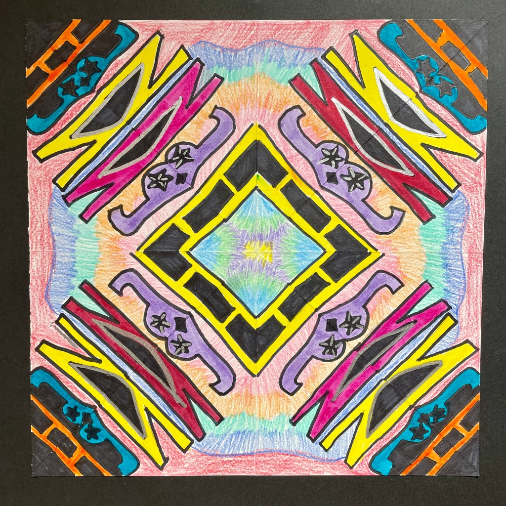 This highly satisfying lesson was perfect for remote learning, as it requires nothing more than a square piece of paper, a pencil, and coloring media such as Sharpies, markers, and Colored Pencils. Students folded their square into 1/8ths, then wrote their name in one triangular section. Using a window at home as a light table, they folded and traced the name design repeatedly until all 8 triangles were filled. The most interesting designs were revealed when students created overlap with some letters in their original triangle, and/or had some letters touch/go off the edges. (This resulted in shapes connecting in dynamic ways as the image repeated in both a mirrored and original format.)