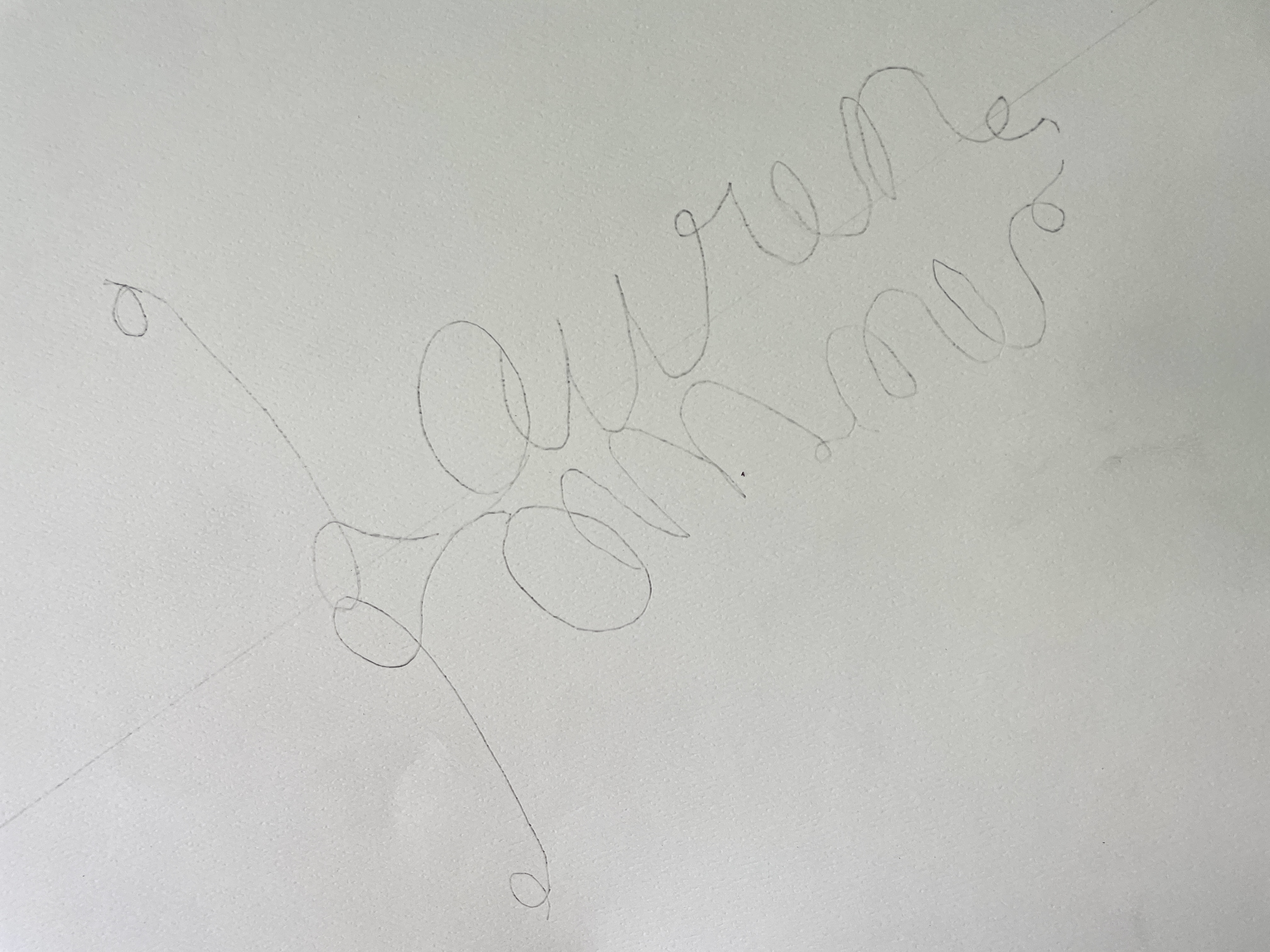 Then, we divided a piece of large watercolor paper on the diagonal. Students traced their name once on the line, —and I required that they either touch or cross the line twice. They then flipped their tracing paper, repositioned it to connect to the first tracing, and traced their name again, this time upside down and backwards. At this point, the name is already transforming into a unique shape. When satisfied, students lightened their lines in preparation for painting.