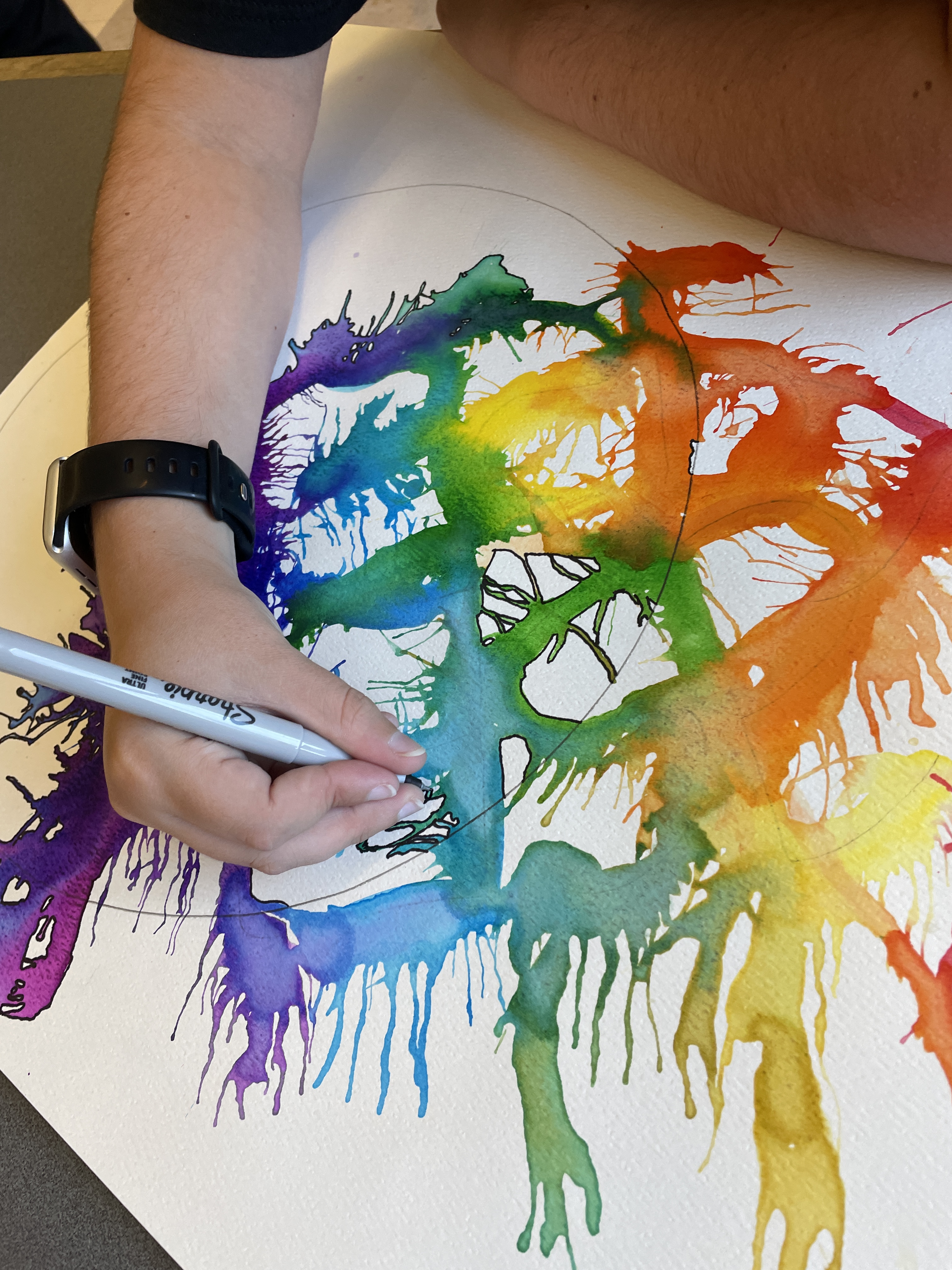 The first step of embellishing was to go in with a thin Sharpie and outline everywhere the color met the white. Secondly, they went into the painted areas themselves and outlined anywhere there was a color or value change. Lastly, they were given the option of using POSCA brand paint pens or metallic pens to add more embellishments and designs. Some students also chose to add freeform doodles and designs into the white areas of their painting.