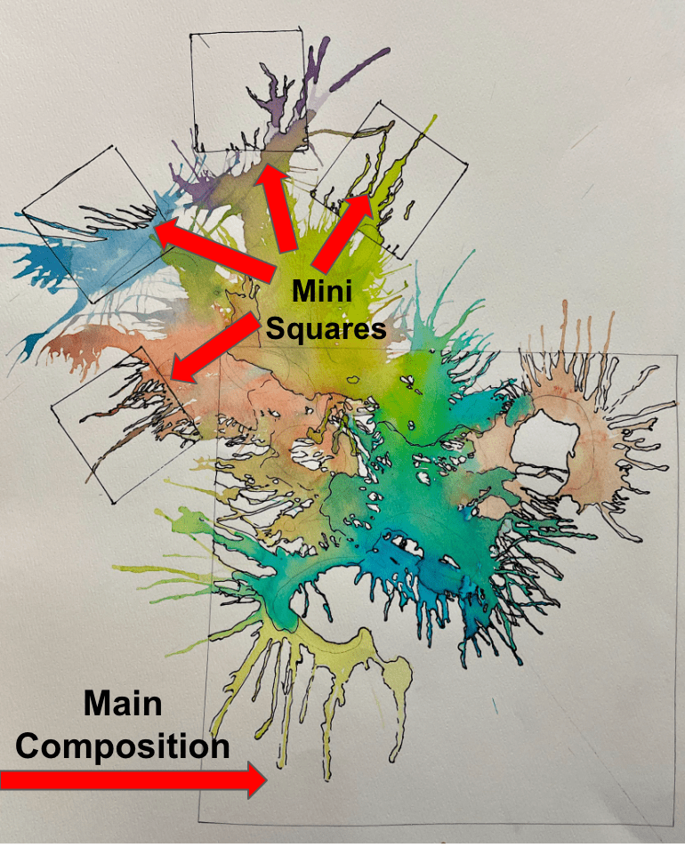 The next day when the paintings were dry, I had a variety of cropping templates for students to choose from: circle, square, two different types of rectangles… Each student selected a highly interesting area of the finished painting to crop and embellish. When cropping their piece, I asked them to consider balance and asymmetry; Sometimes a concentrated area of color balanced with a quiet area of white can make for something visually dynamic!