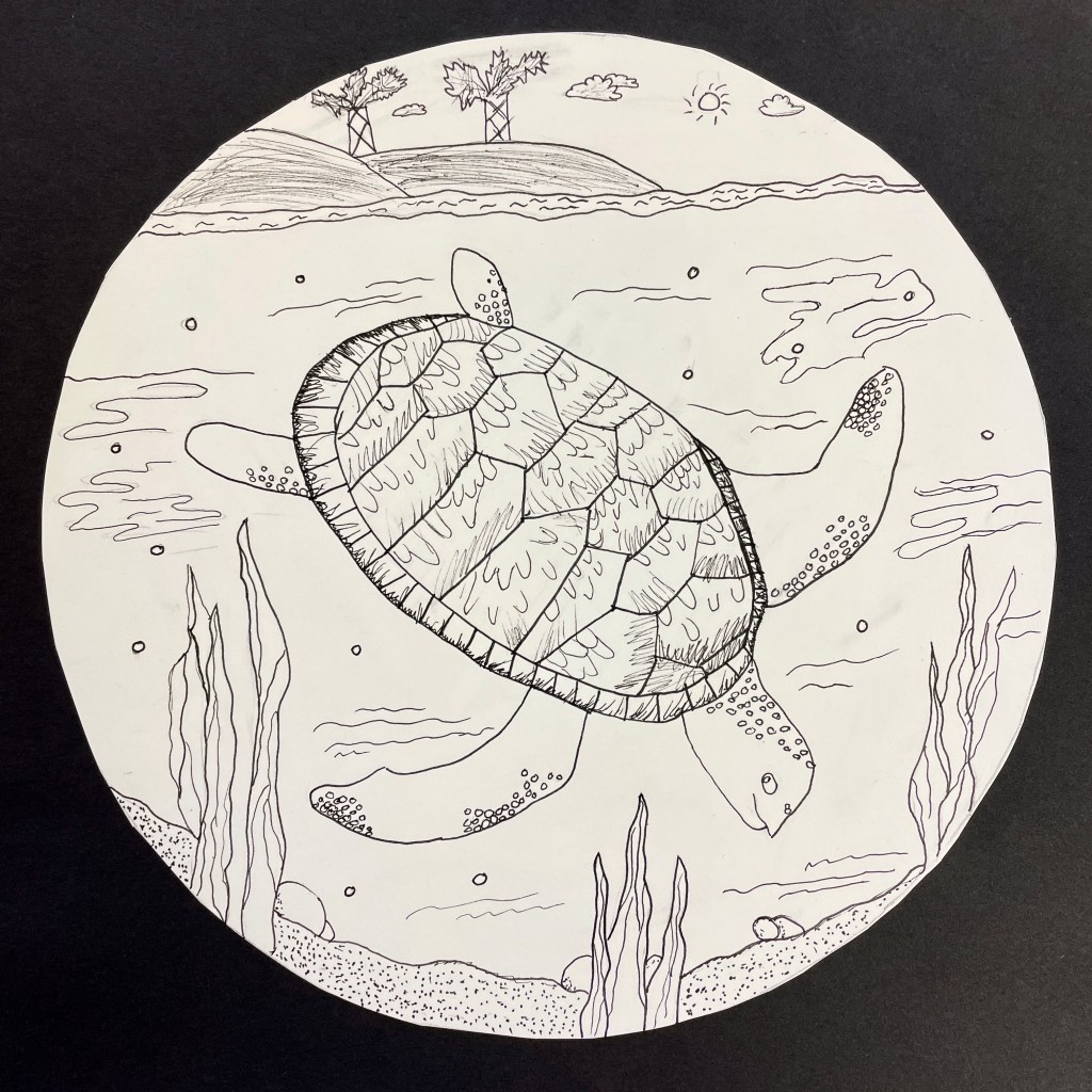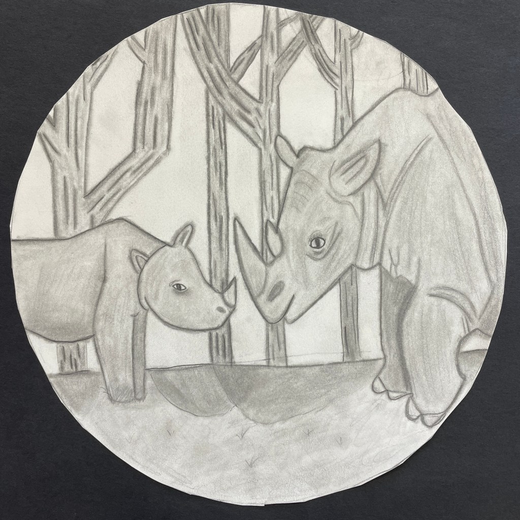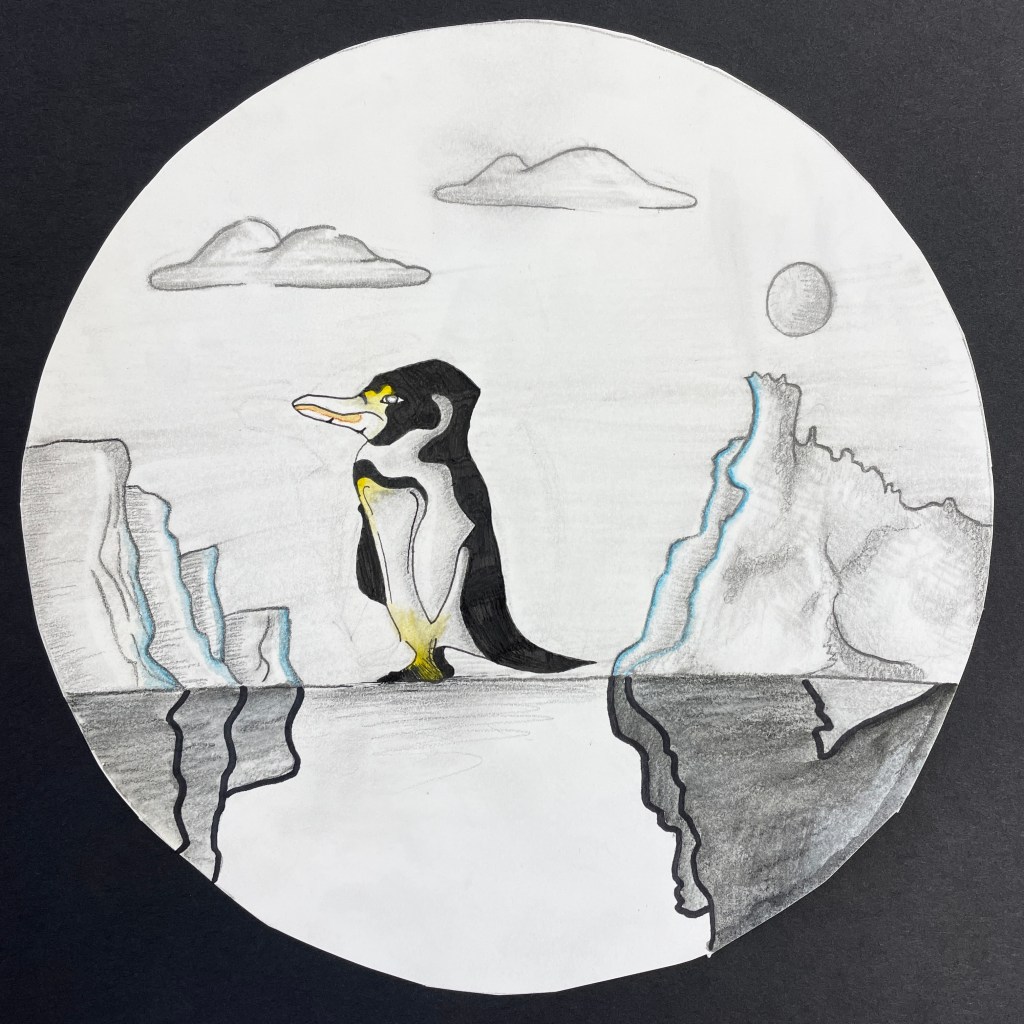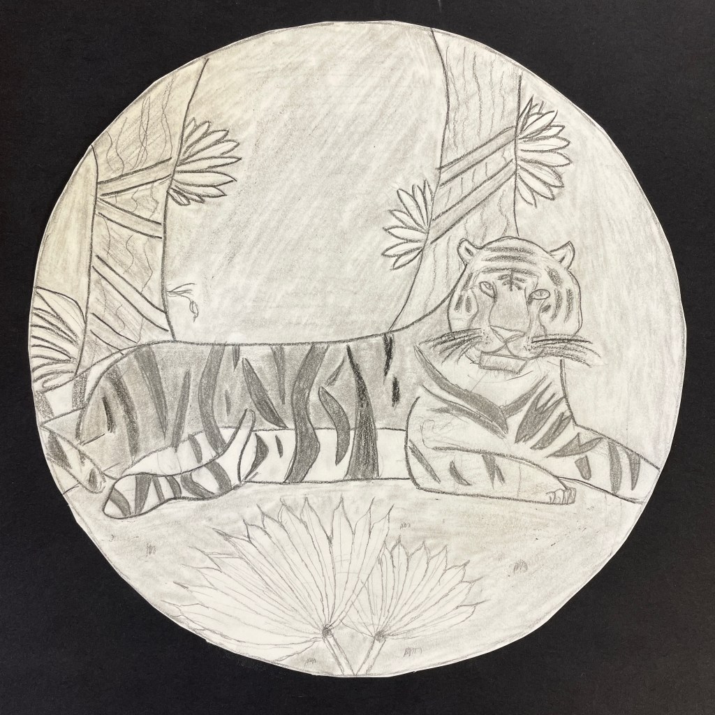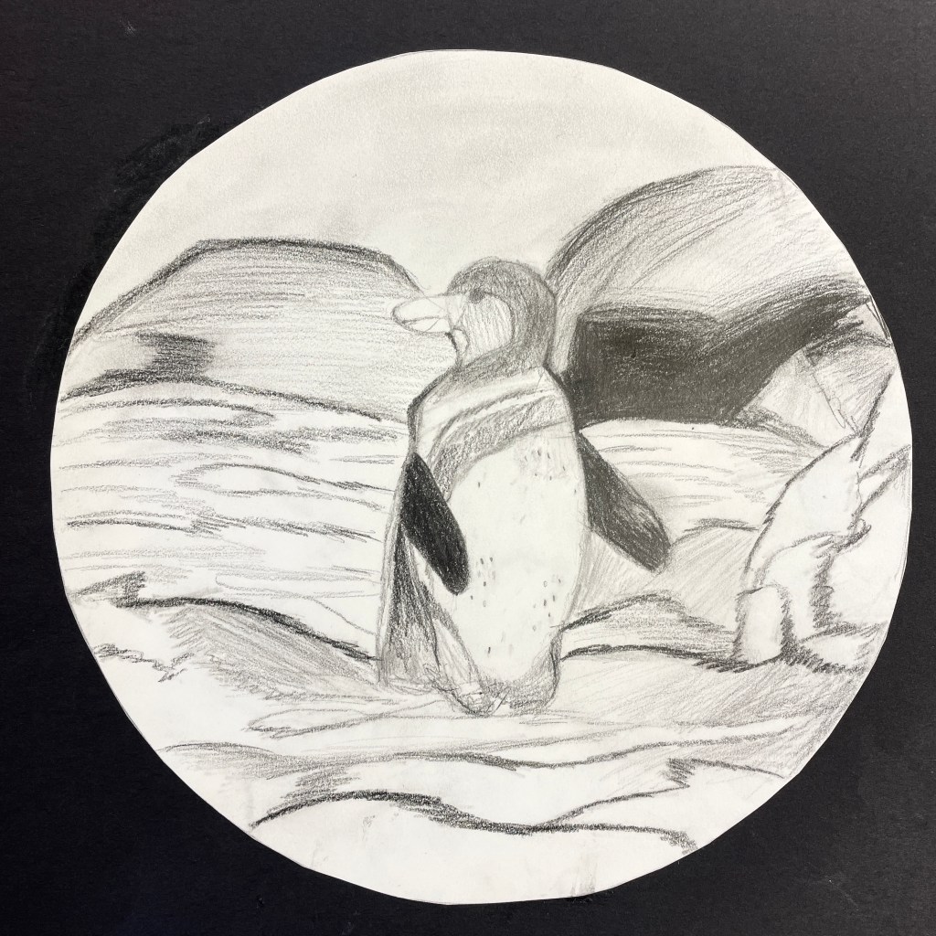 A note on the illustration. This lesson followed a landscape assignment entitled “Winter Windows” in which we learn how to create the illusion of depth on a 2-dimensional surface using the relative size and placement of elements to suggest foreground, middle ground and background. Part of the goals for this drawing was to build upon their knowledge of landscape drawing in order to depict a realistic and appropriate biome/environment for their animal illustration. I gave the students the choice of completing their final drawing with three different materials options: pencil only, Sharpie/Micron pen only, (“Pen and ink”), or colored pencils, (either regular or watercolor type). In previous lessons we had discussed creating value through varied pencil pressure, color mixing, and blending. It was up to each individual student to expand their skillset and apply what they had learned to this assignment. The choice of a 9” circle as the final illustration shape was fun, different, and a nod to our shared planet: Earth! It worked perfectly for this Eco-friendly assignment!