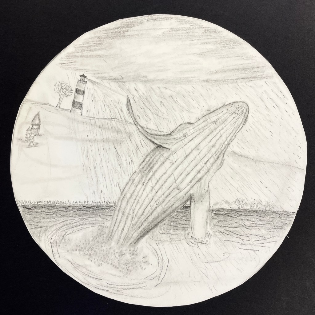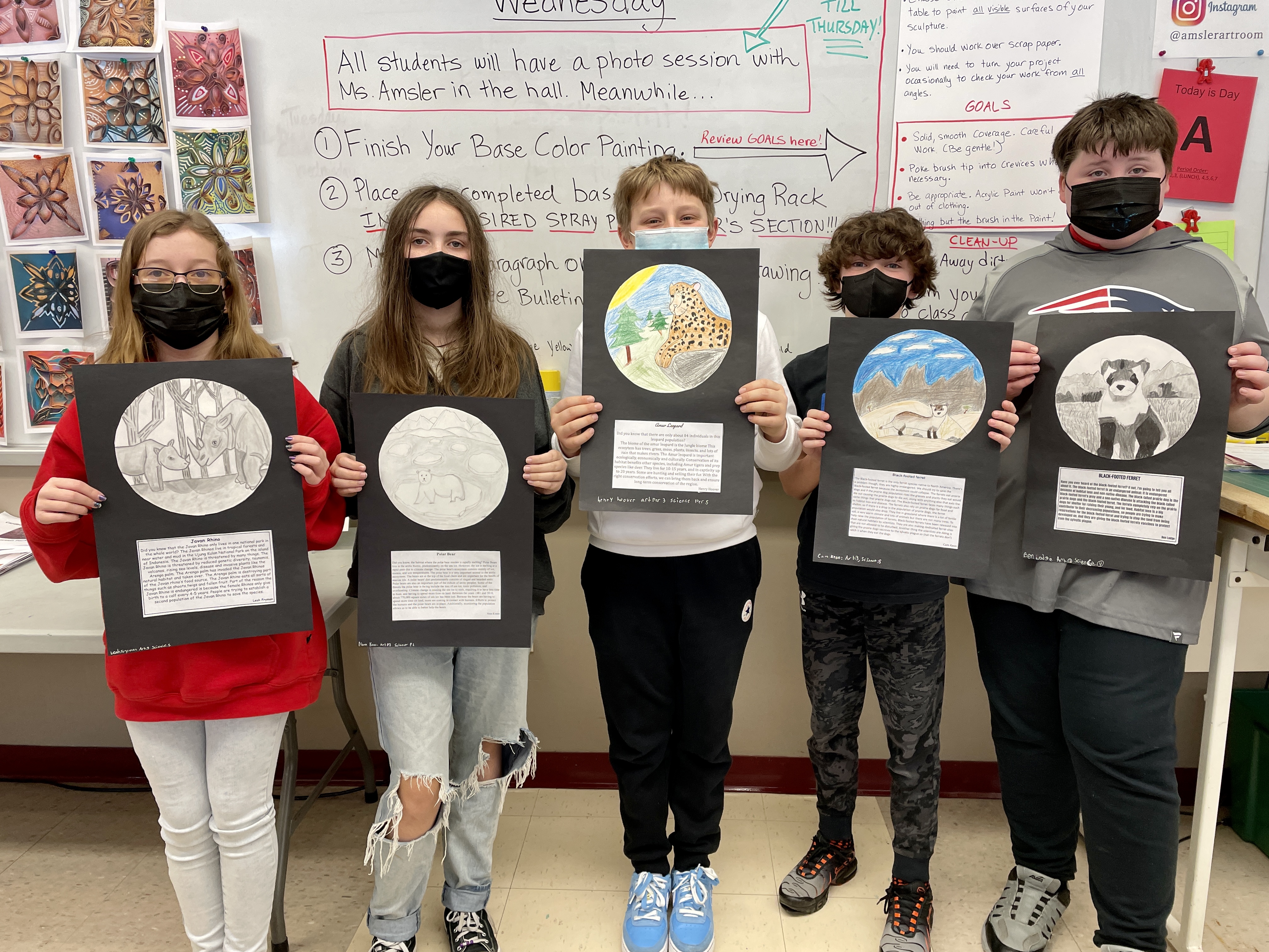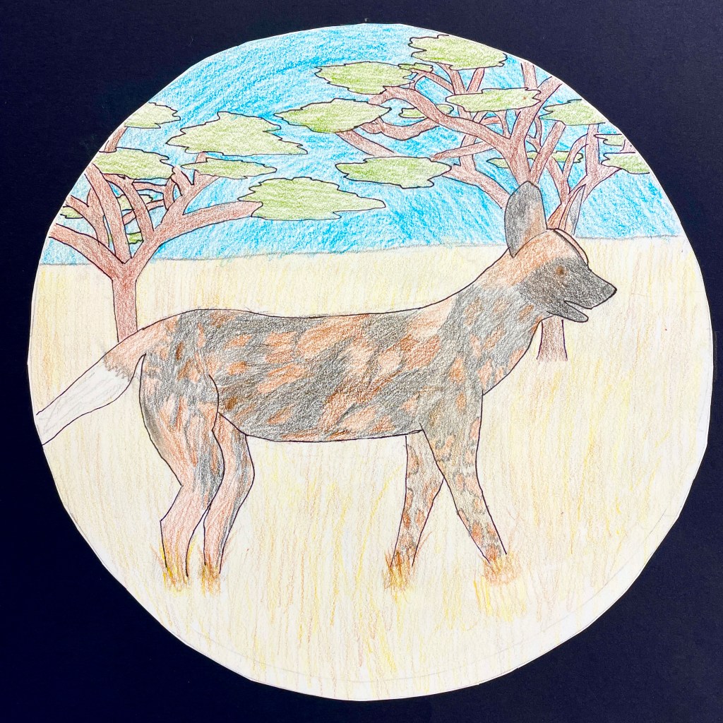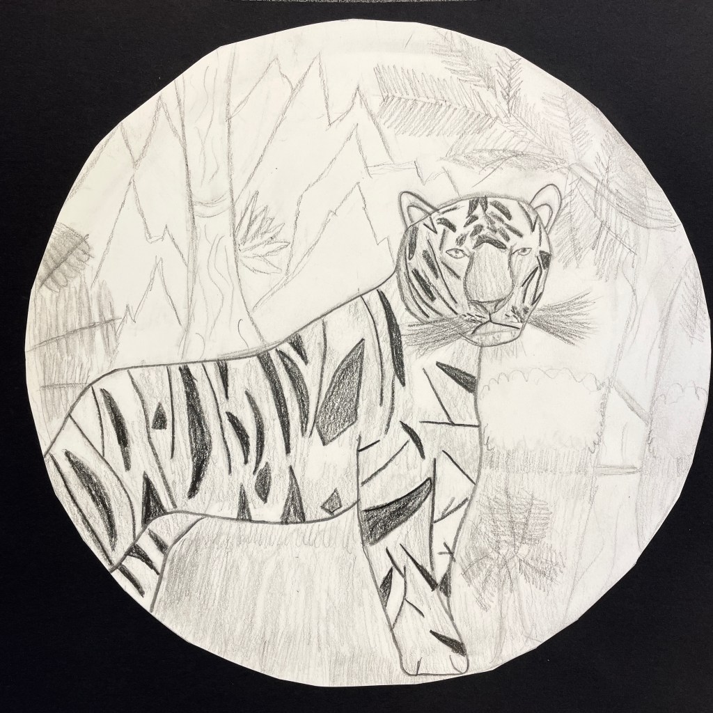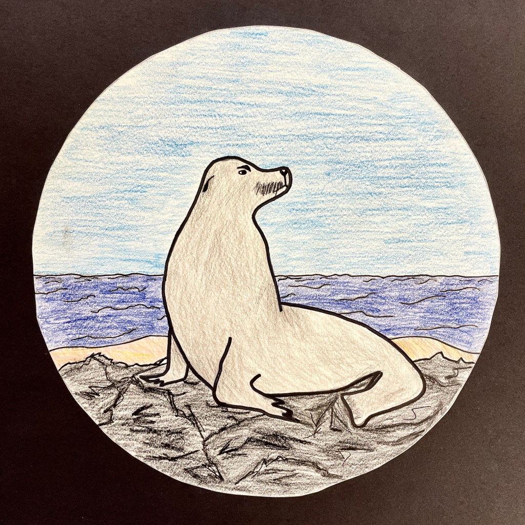 A note on the illustration. This lesson followed a landscape assignment entitled “Winter Windows” in which we learn how to create the illusion of depth on a 2-dimensional surface using the relative size and placement of elements to suggest foreground, middle ground and background. Part of the goals for this drawing was to build upon their knowledge of landscape drawing in order to depict a realistic and appropriate biome/environment for their animal illustration. I gave the students the choice of completing their final drawing with three different materials options: pencil only, Sharpie/Micron pen only, (“Pen and ink”), or colored pencils, (either regular or watercolor type). In previous lessons we had discussed creating value through varied pencil pressure, color mixing, and blending. It was up to each individual student to expand their skillset and apply what they had learned to this assignment. The choice of a 9” circle as the final illustration shape was fun, different, and a nod to our shared planet: Earth! It worked perfectly for this Eco-friendly assignment!