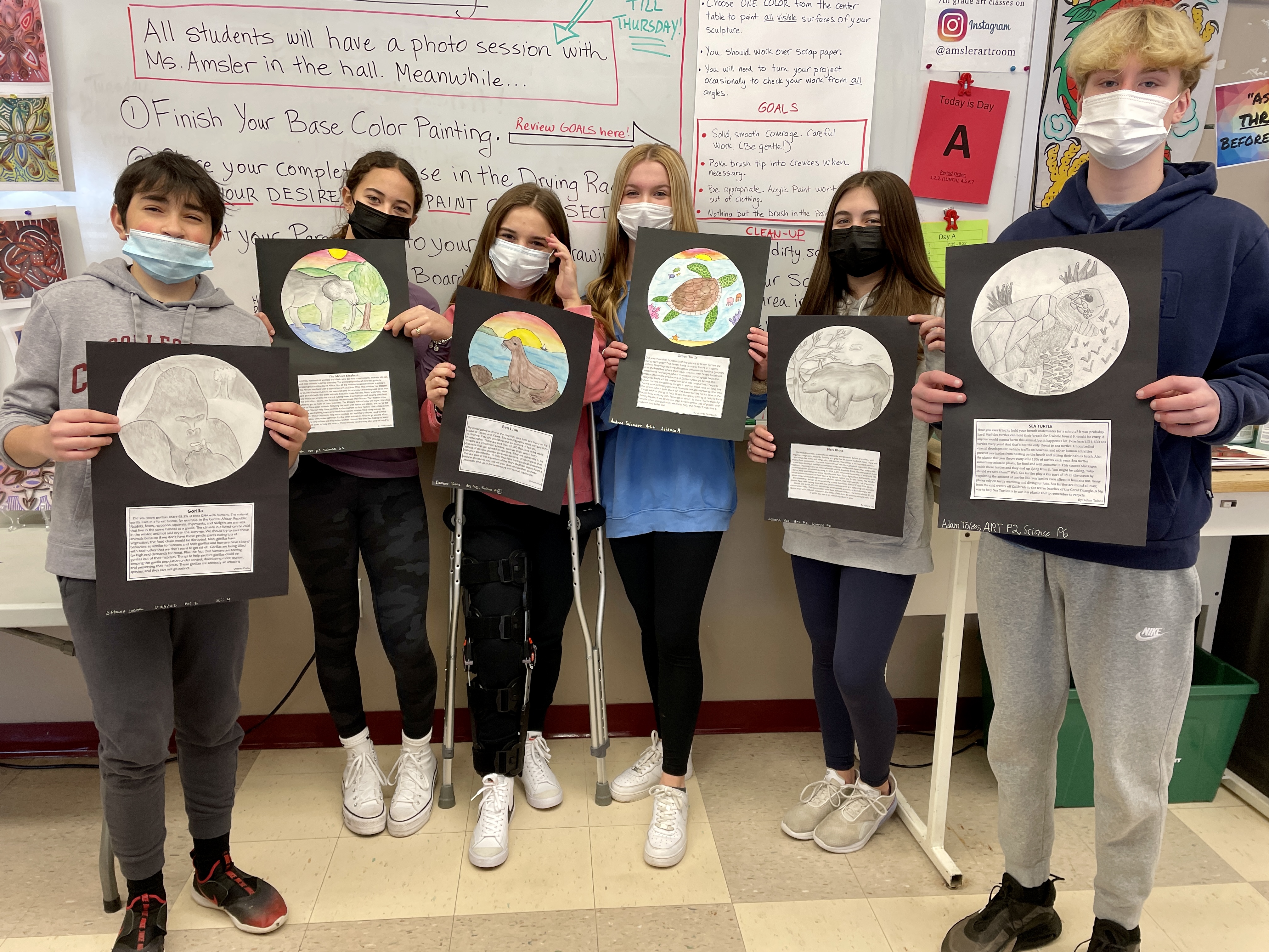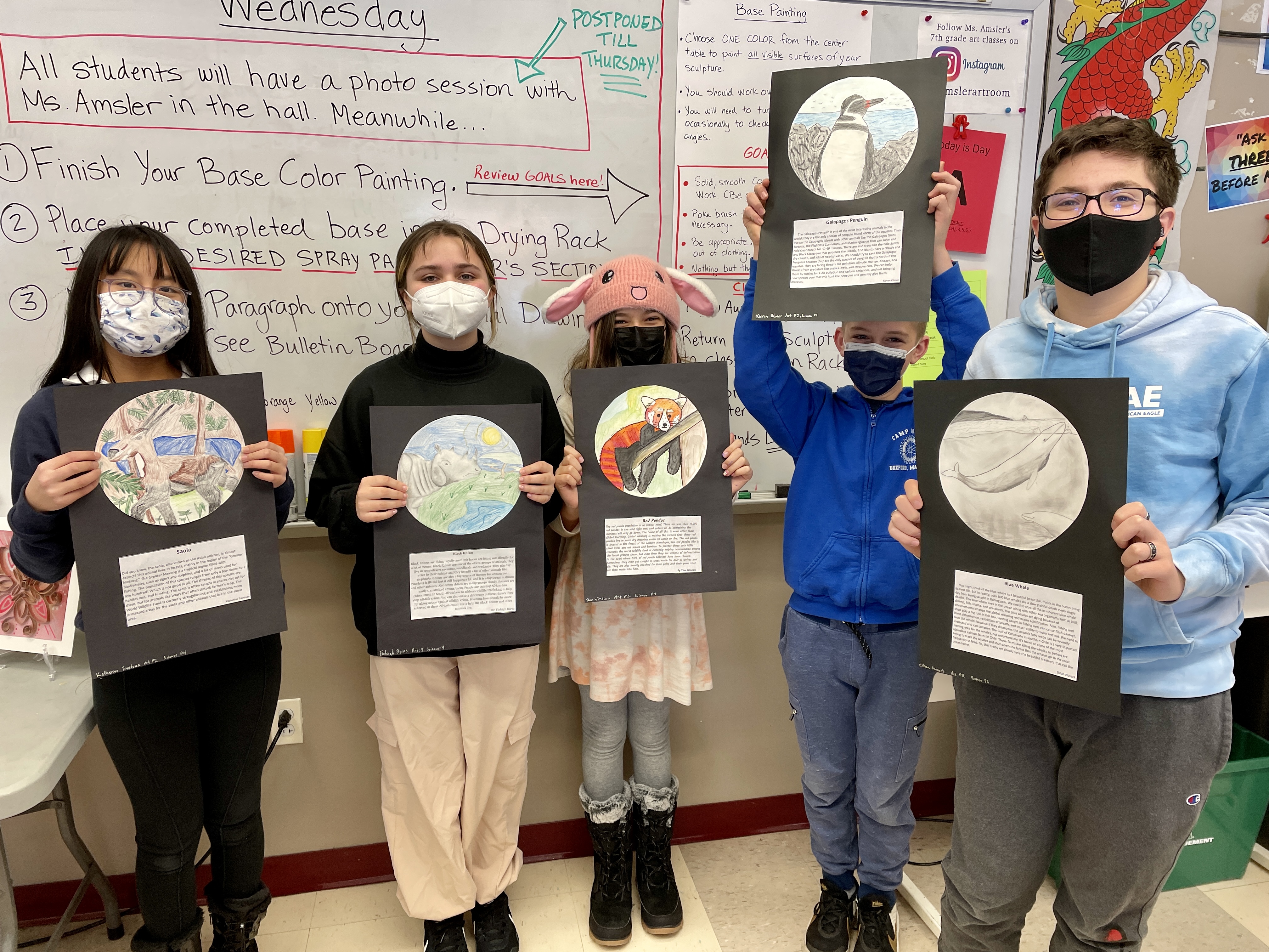 Here are some proud students with their finished research and art, as well as some of our bulletin board displays!