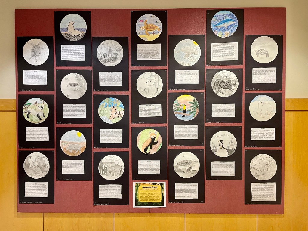 Looking to incorporate some interdisciplinary learning into your art classroom? This Endangered Species Illustration project was completed in collaboration with our science department. Students conducted research, drew an animal in its natural habitat, and wrote an accompanying descriptive paragraph during both their science and art classes!