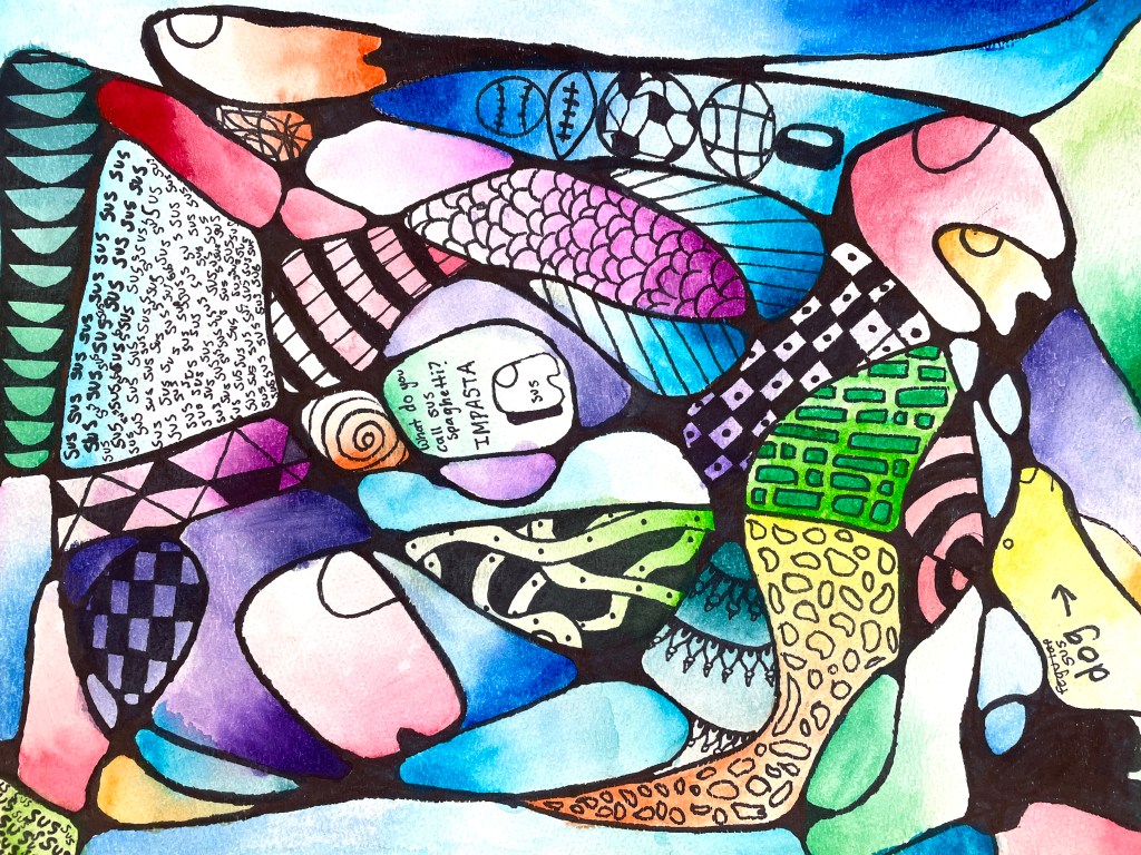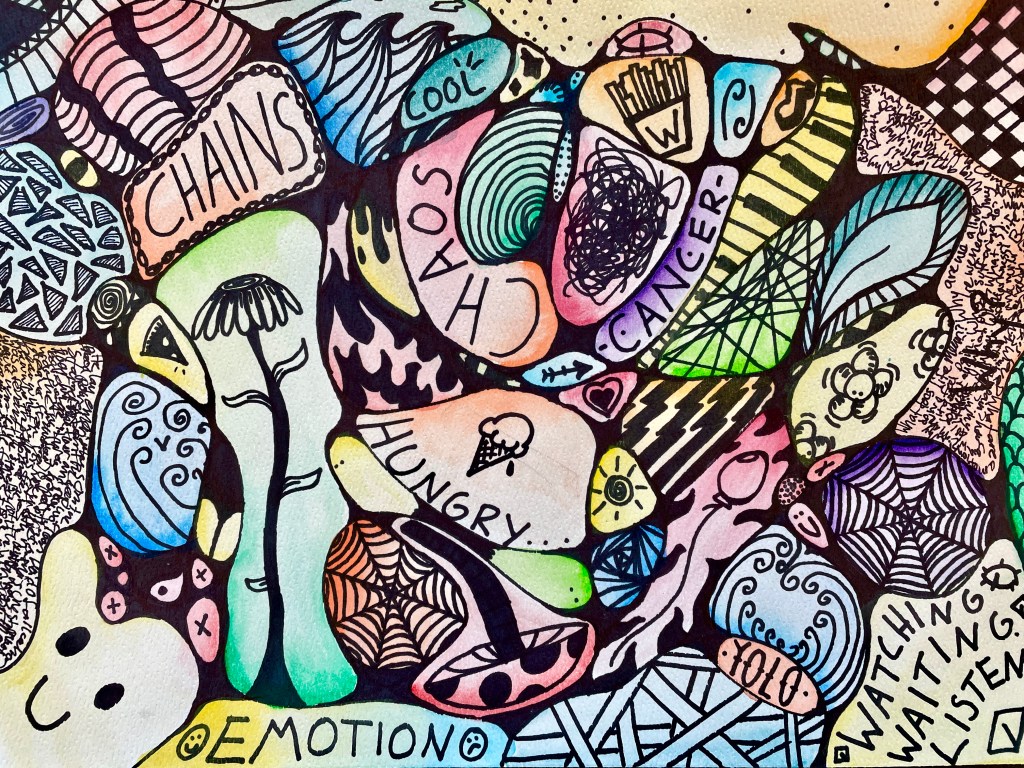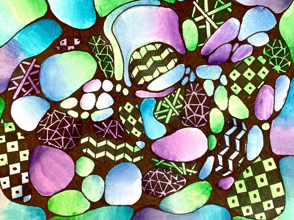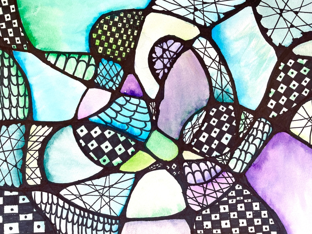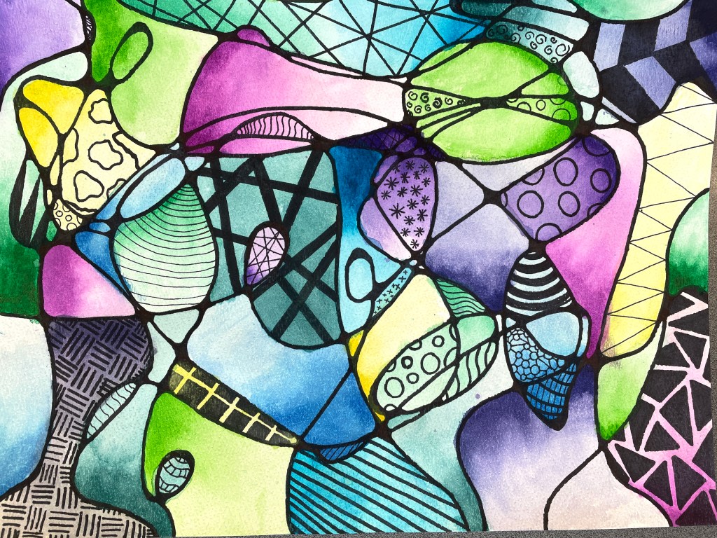 When students finish this β€œrounding” step, we moved on to filling some of the white spaces with patterns, doodles, or free-form text and writing. Students used Sharpie for this, mixing and matching these options freely. They were required to fill at least 1/3 of their white space, and consider how to balance empty and filled spaces in a pleasing way. TIP: Providing Zentangle packets and other doodle and design sheets for inspiration during this step will yield the best results!