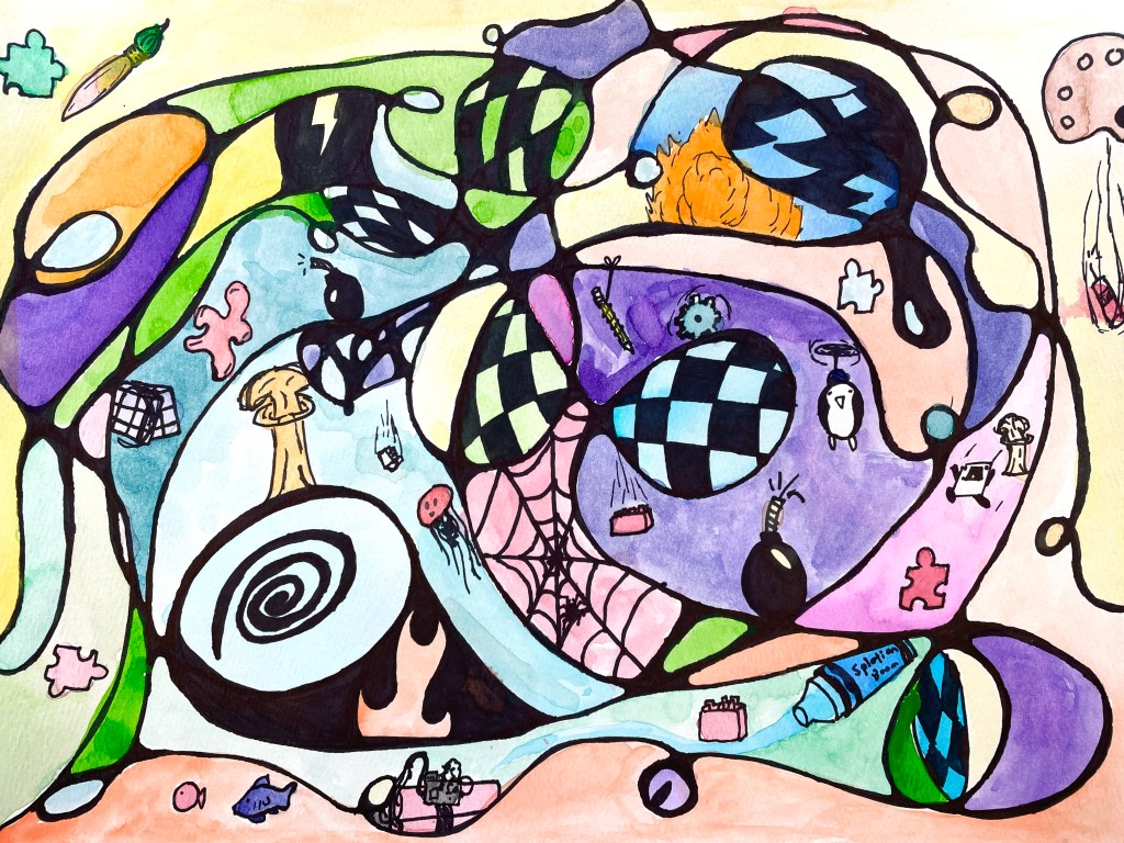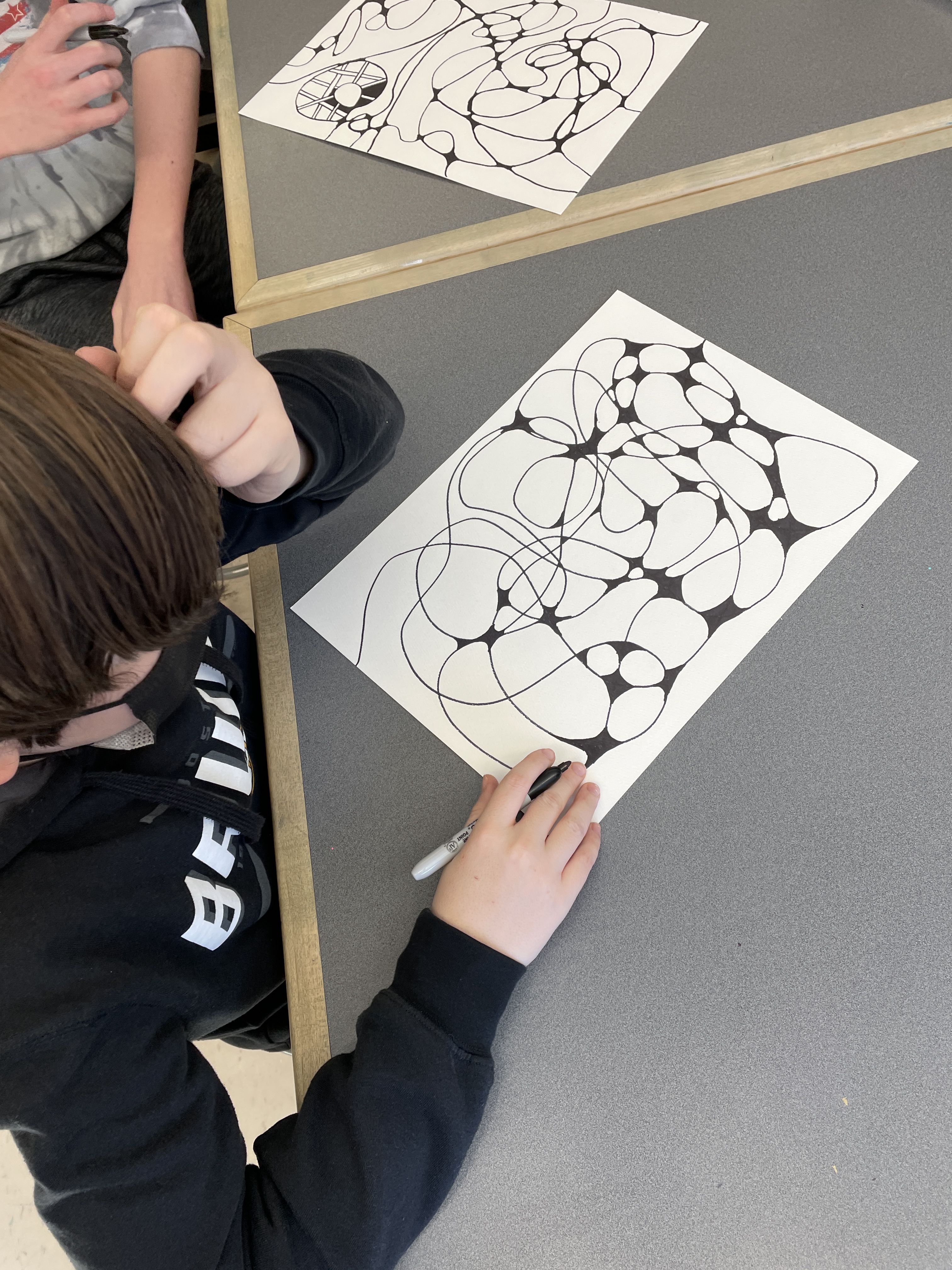 Next, any lines that intersect are β€œrounded” out so that the remaining white paper consists of only organic forms and no straight corners or lines. Lines may also be thickened during this step to contribute to the organic forms that are developing. This step can take a whole class period or two, and is reminiscent of how Elmer’s glue might look if dribbled on a piece of paper, β€œblobbing” together where it crosses over itself.