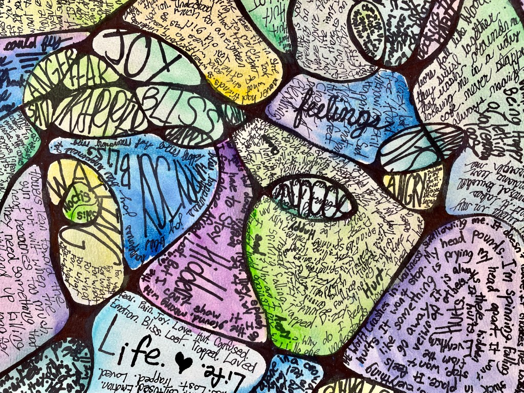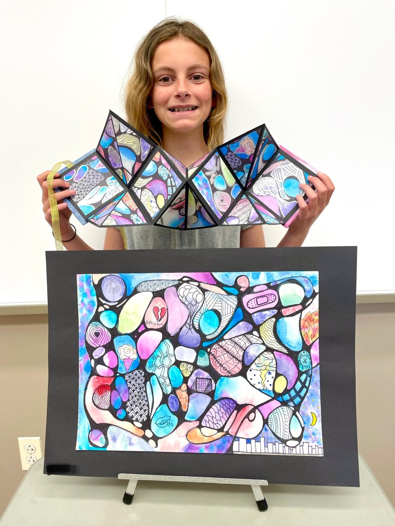 Want to know MORE FUN things you can do with your Neurographic Art? Make Explosion Books! Once again, I had my students create a stand-alone piece of Neurographic art with patterns and watercolor. Each student then received two full-sized color photocopies of their completed art. We selectively cropped interesting areas from the copies, embellished them with metallic pen, and used these images in the Explosion Books. CLICK HERE to learn about making Explosion Books!