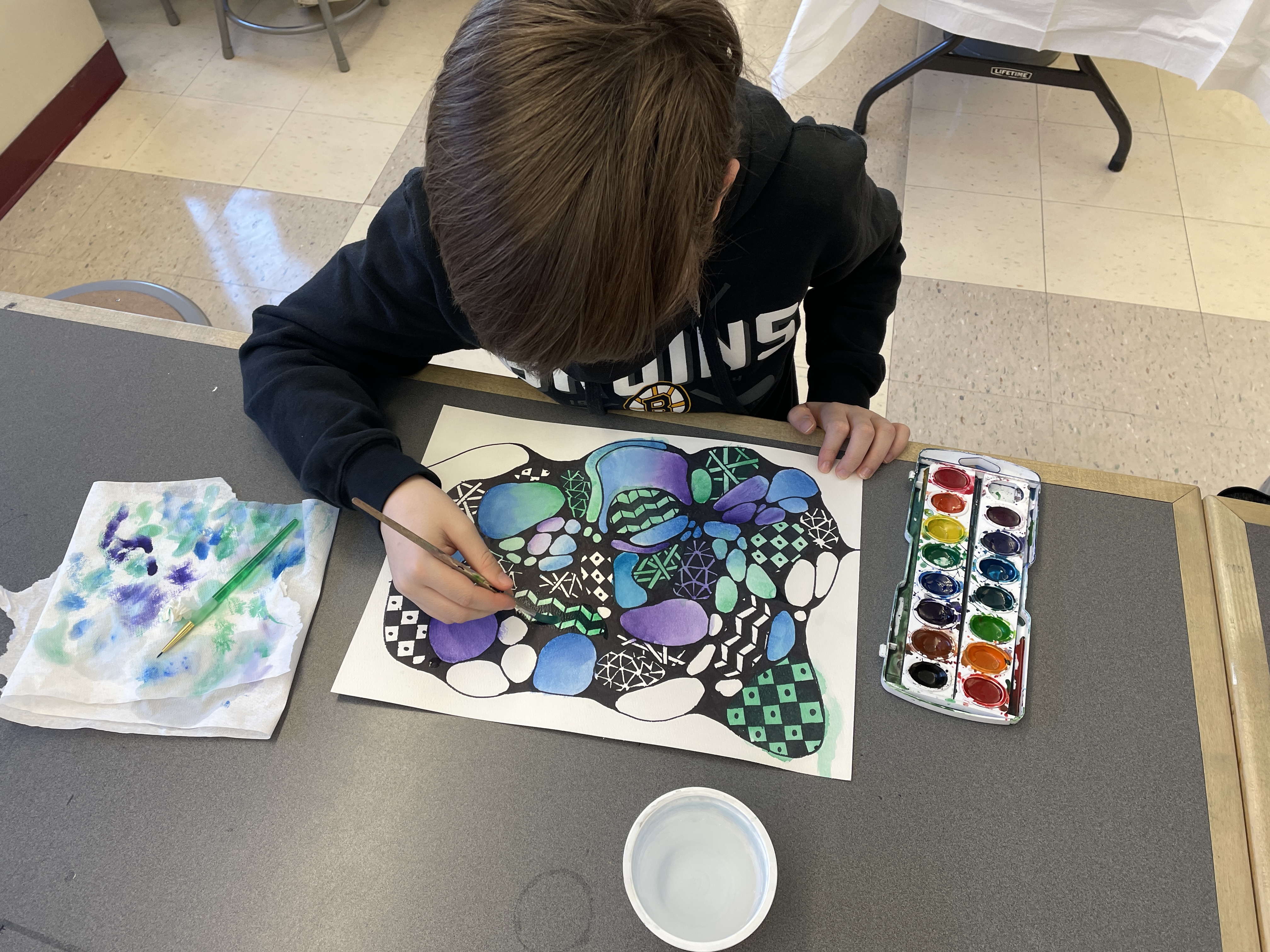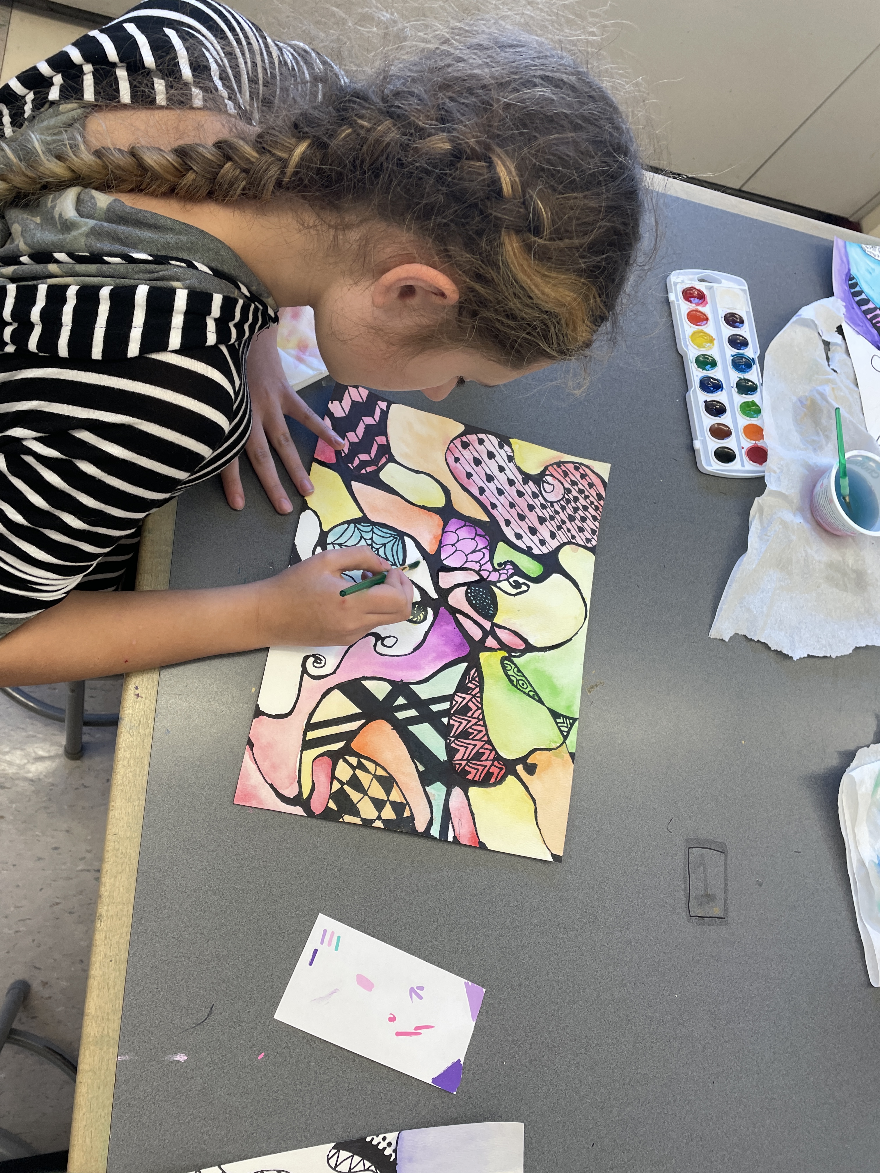 To begin, students used a Sharpie and a free, gestural arm motion to draw a continuous, looping line across an 11” by 15” piece of watercolor paper for a slow count of five. After that, they could add more lines to balance the space, crisscrossing other lines freely, or can continue with their original line until they felt they had filled the space in a balanced way. Any line segments that end in the middle of the paper are extended to the edge.