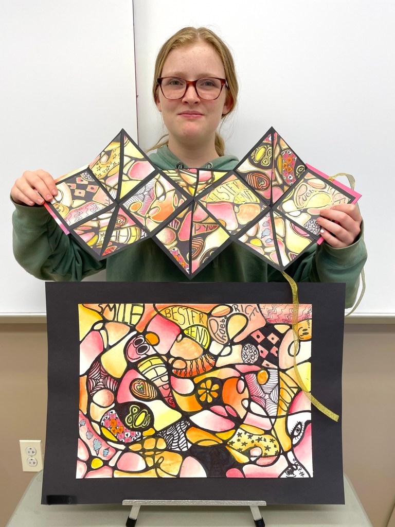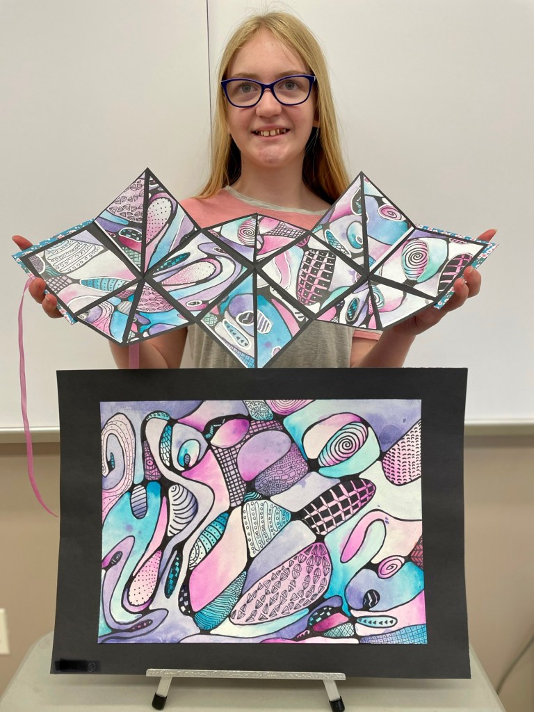 The photos below shows a student working on her Neurographic Art and her completed self portrait with a maroon color copy of her finished Neurographic Art as the background.