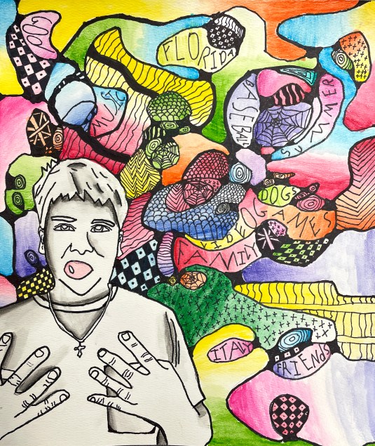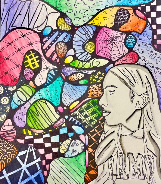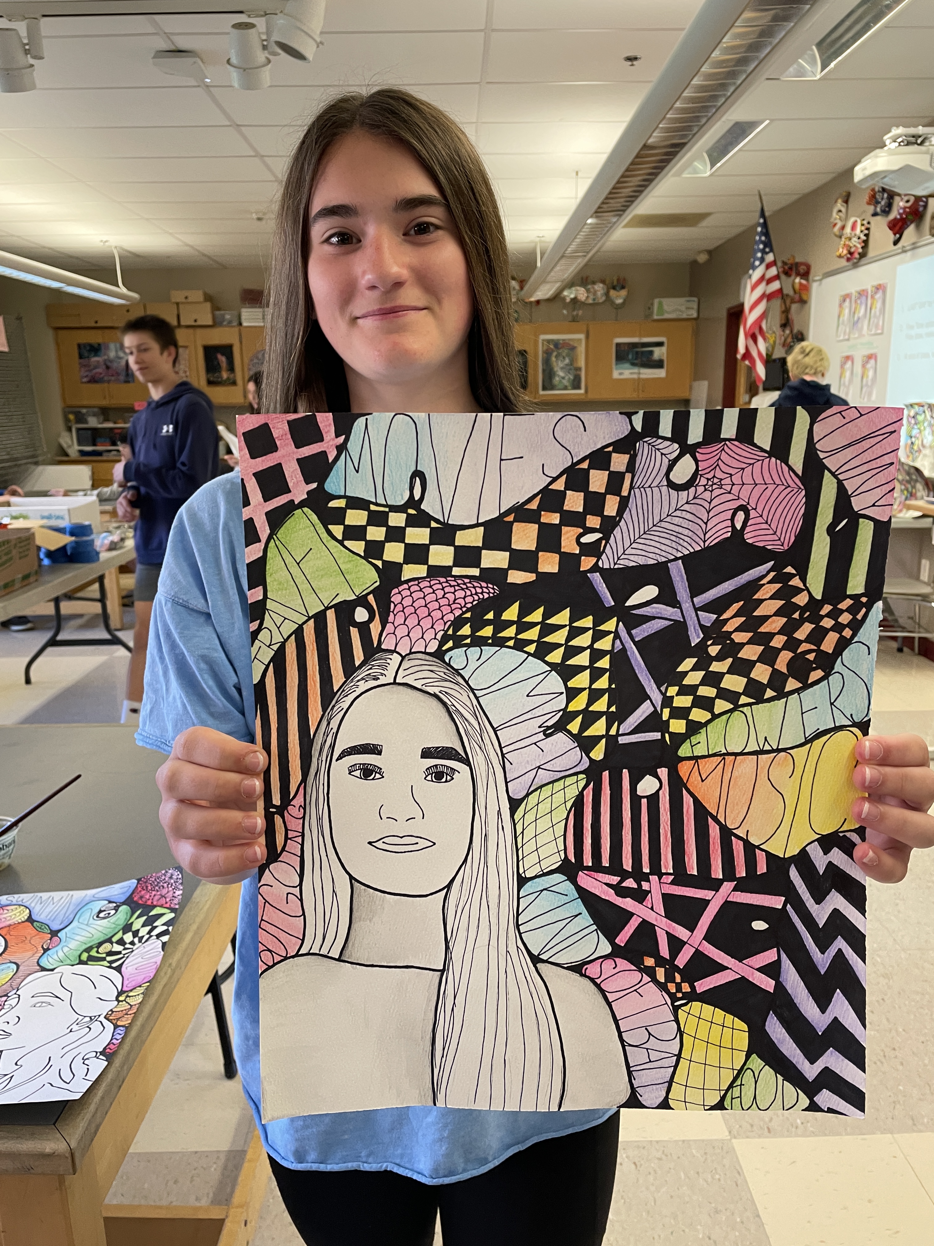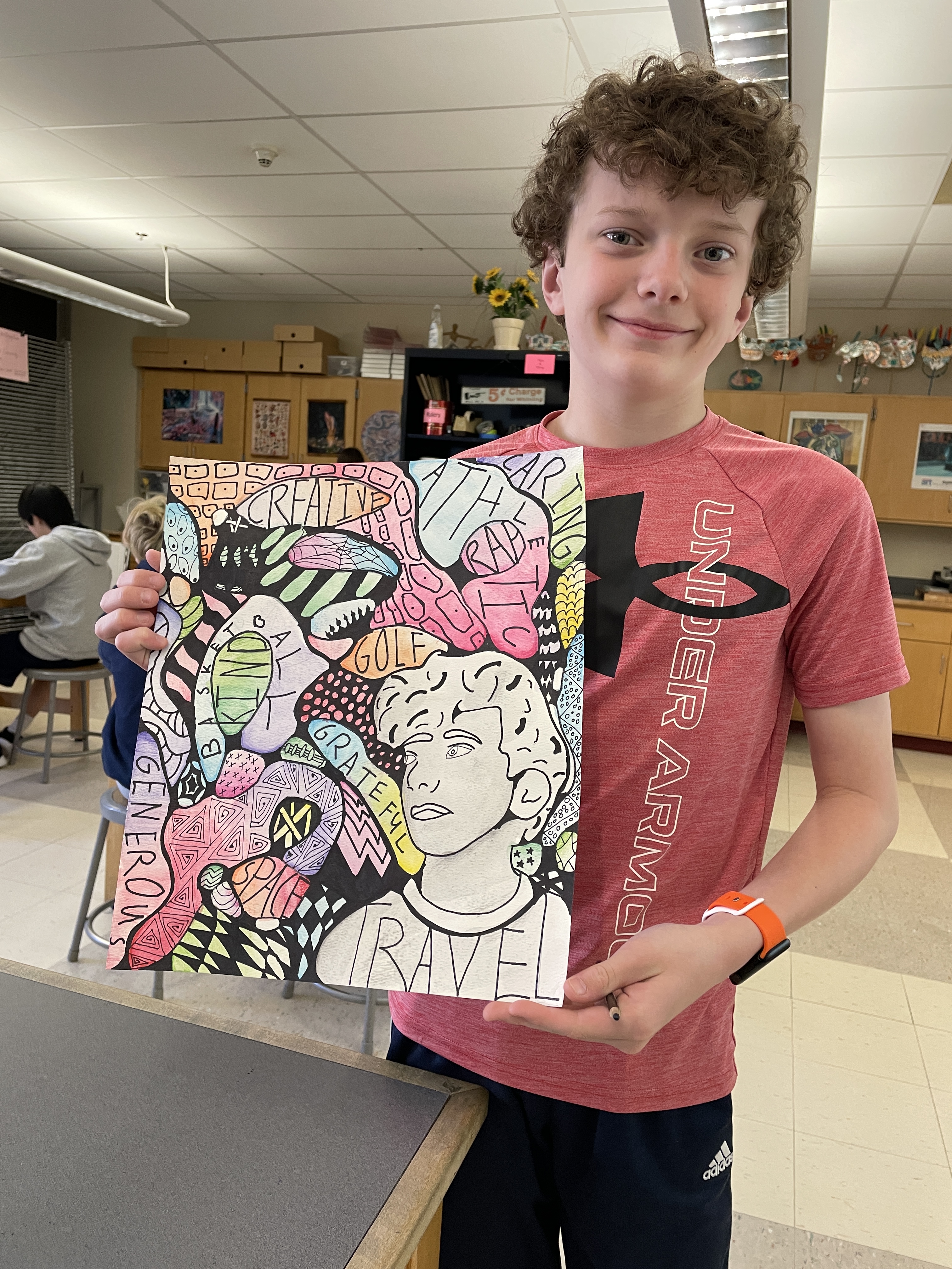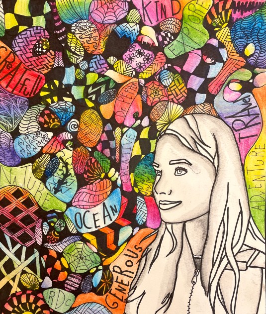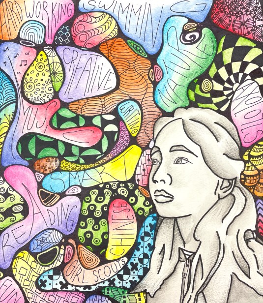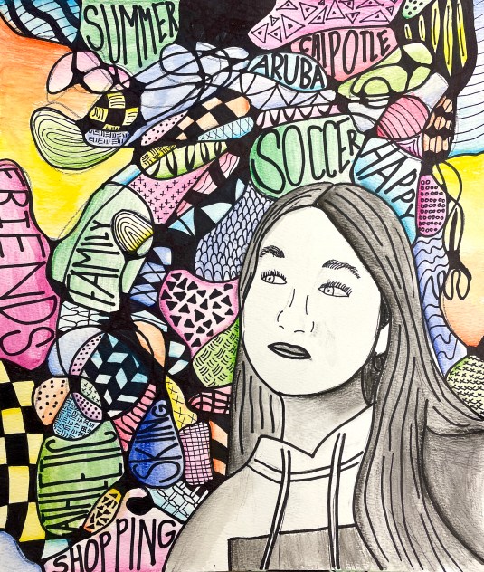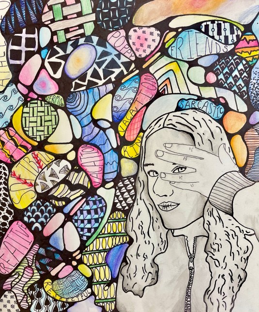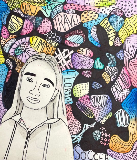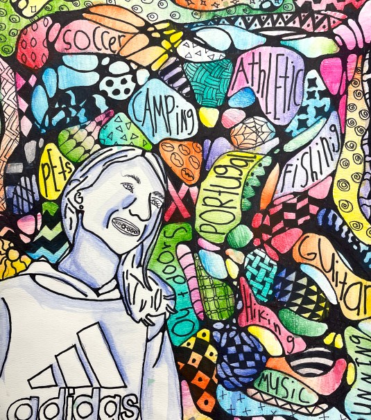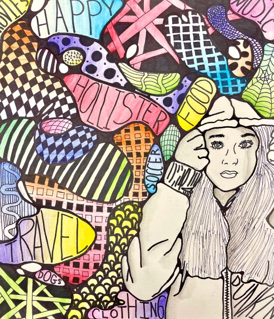 This trimester, I decided to change up my Neurographic art assignment to include an element of self-portraiture. Students traced an 8 x 10 photo of themselves as a contour line drawing and then transferred their tracing into a corner of a piece of a 13” by 15” white watercolor paper. They then created Neurographic art and patterns in the background, and included a minimum of 10 personal words which describe their personality, characteristics or traits. These words had to be “stretched or smooshed” in order to fill the space creatively and effectively. (Pro-tip: I found through trial and error that if the kids leave a very small blank space between the letters and the edge of the shape, it helps with the readability of the word.)