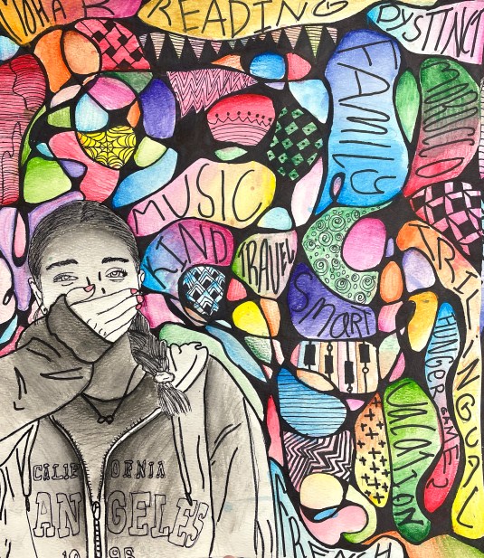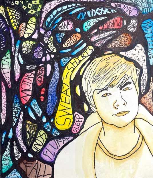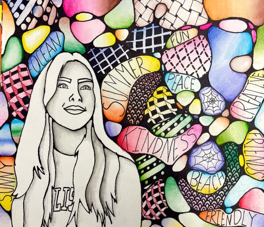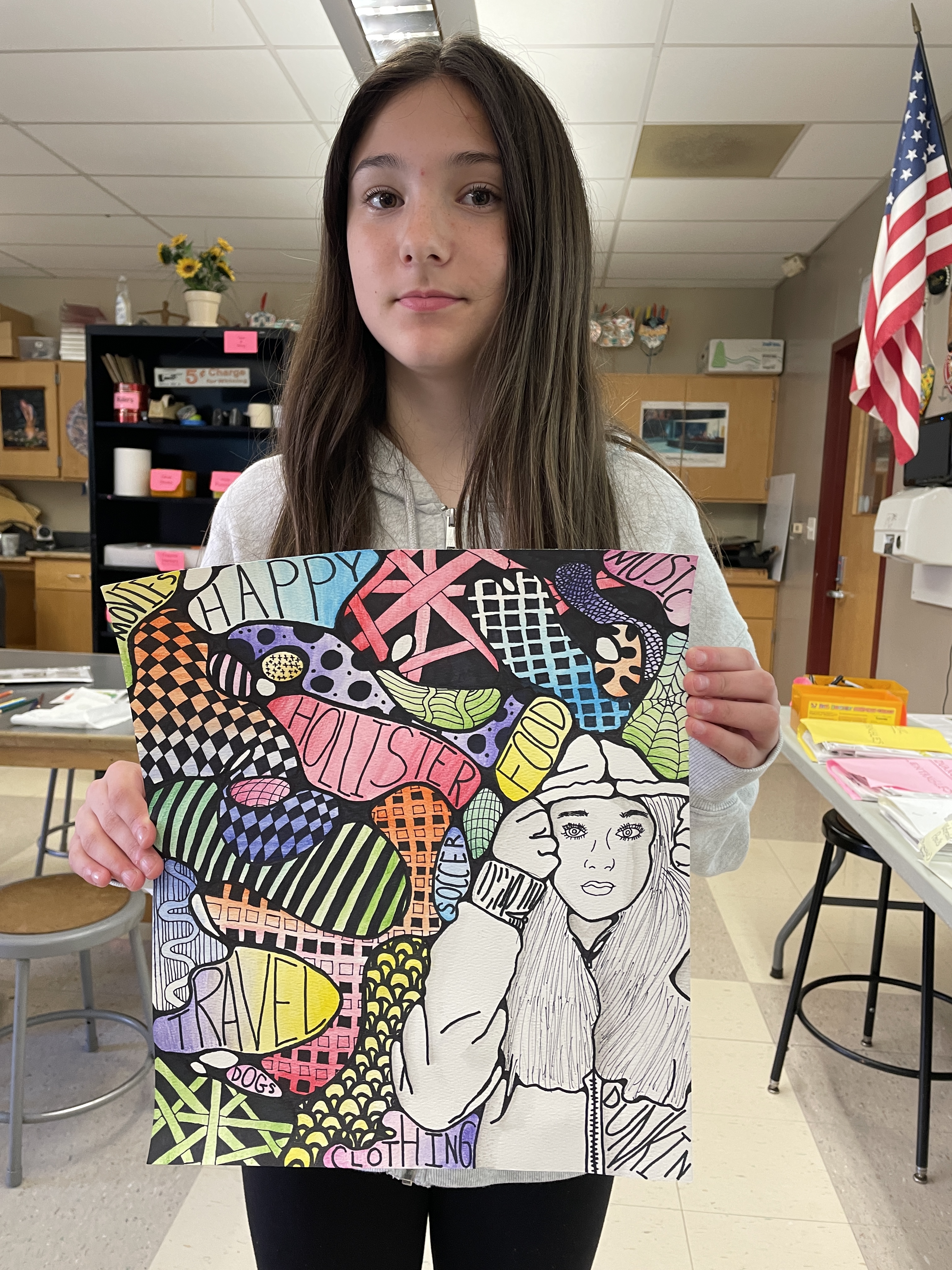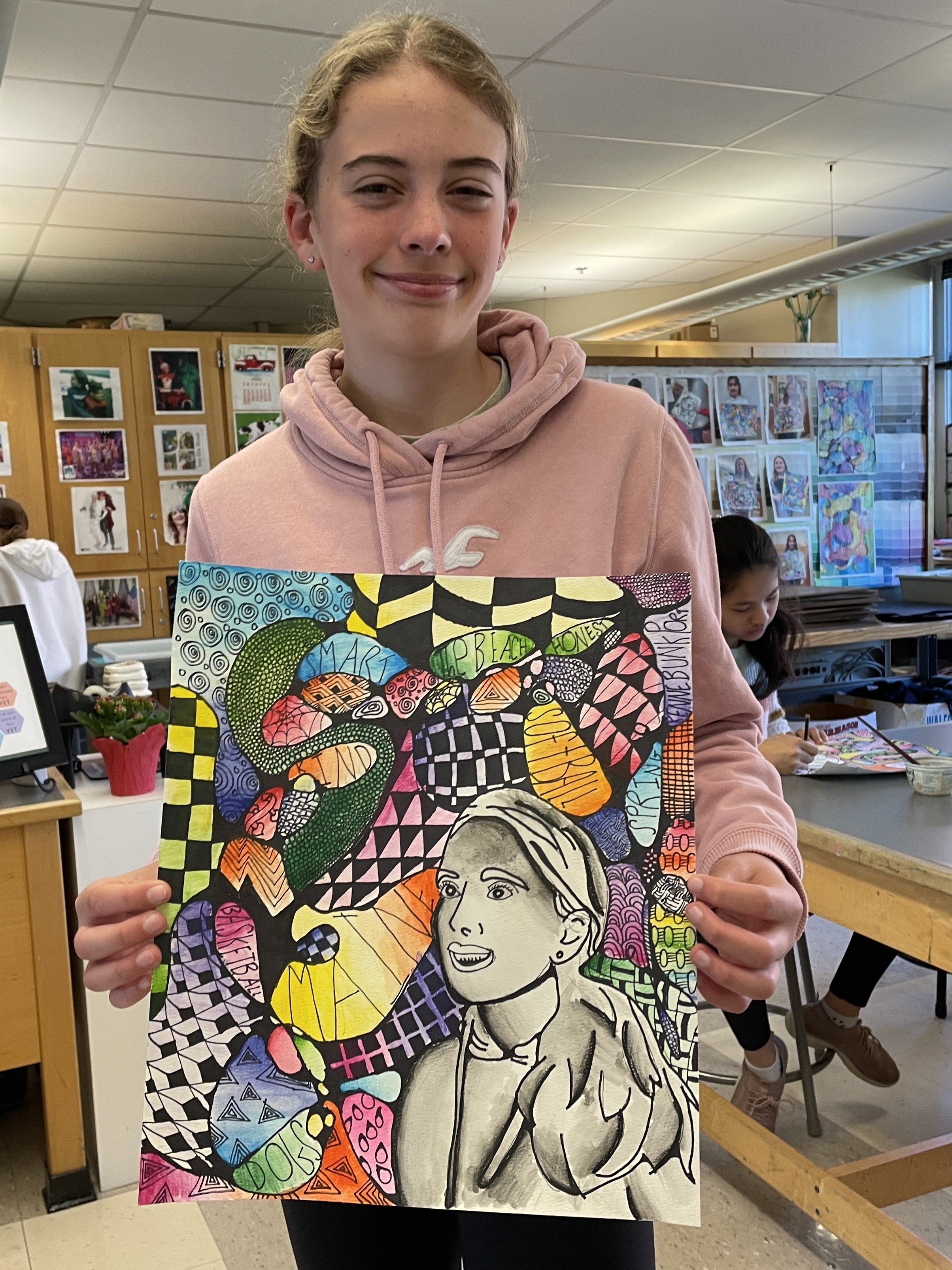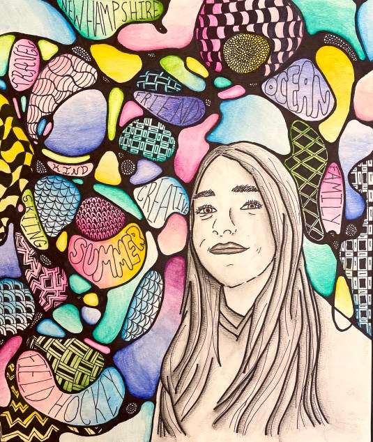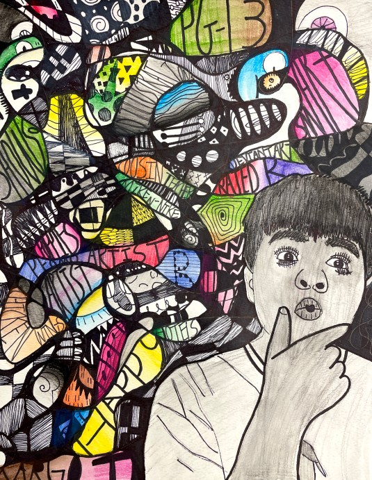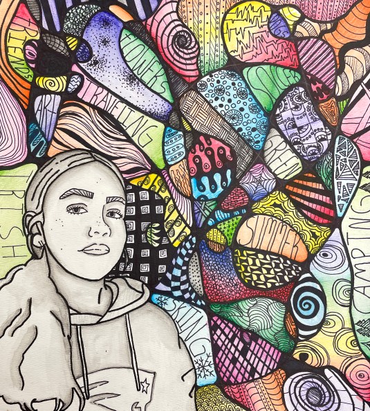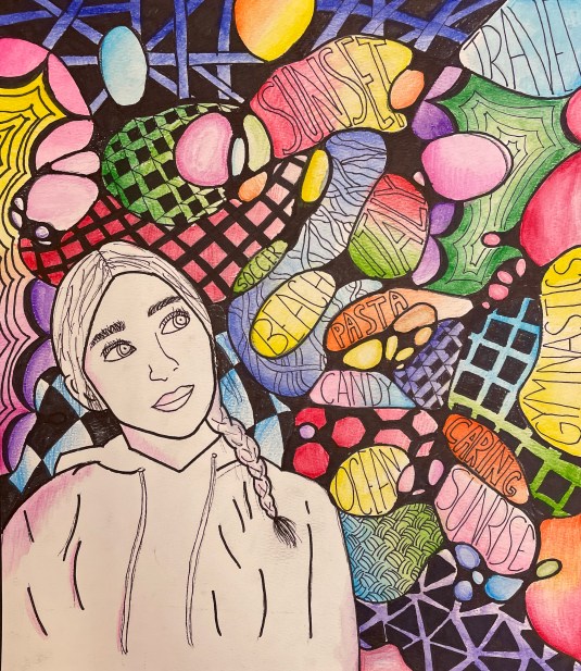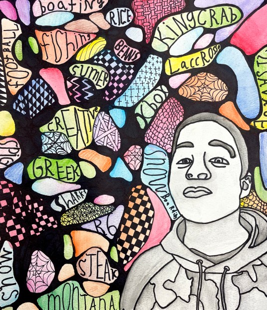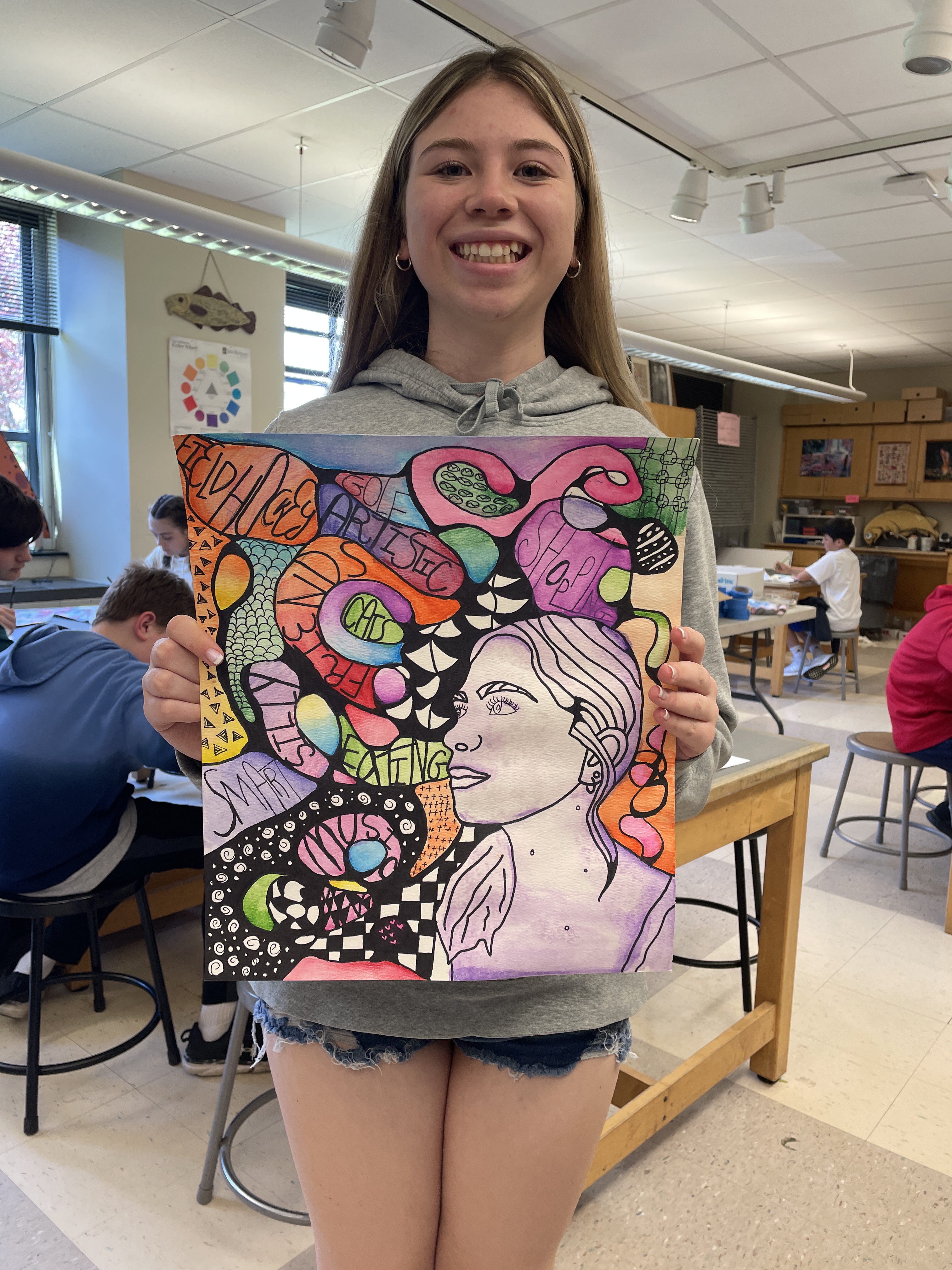 This trimester, I decided to change up my Neurographic art assignment to include an element of self-portraiture. Students traced an 8 x 10 photo of themselves as a contour line drawing and then transferred their tracing into a corner of a piece of a 13” by 15” white watercolor paper. They then created Neurographic art and patterns in the background, and included a minimum of 10 personal words which describe their personality, characteristics or traits. These words had to be “stretched or smooshed” in order to fill the space creatively and effectively. (Pro-tip: I found through trial and error that if the kids leave a very small blank space between the letters and the edge of the shape, it helps with the readability of the word.)