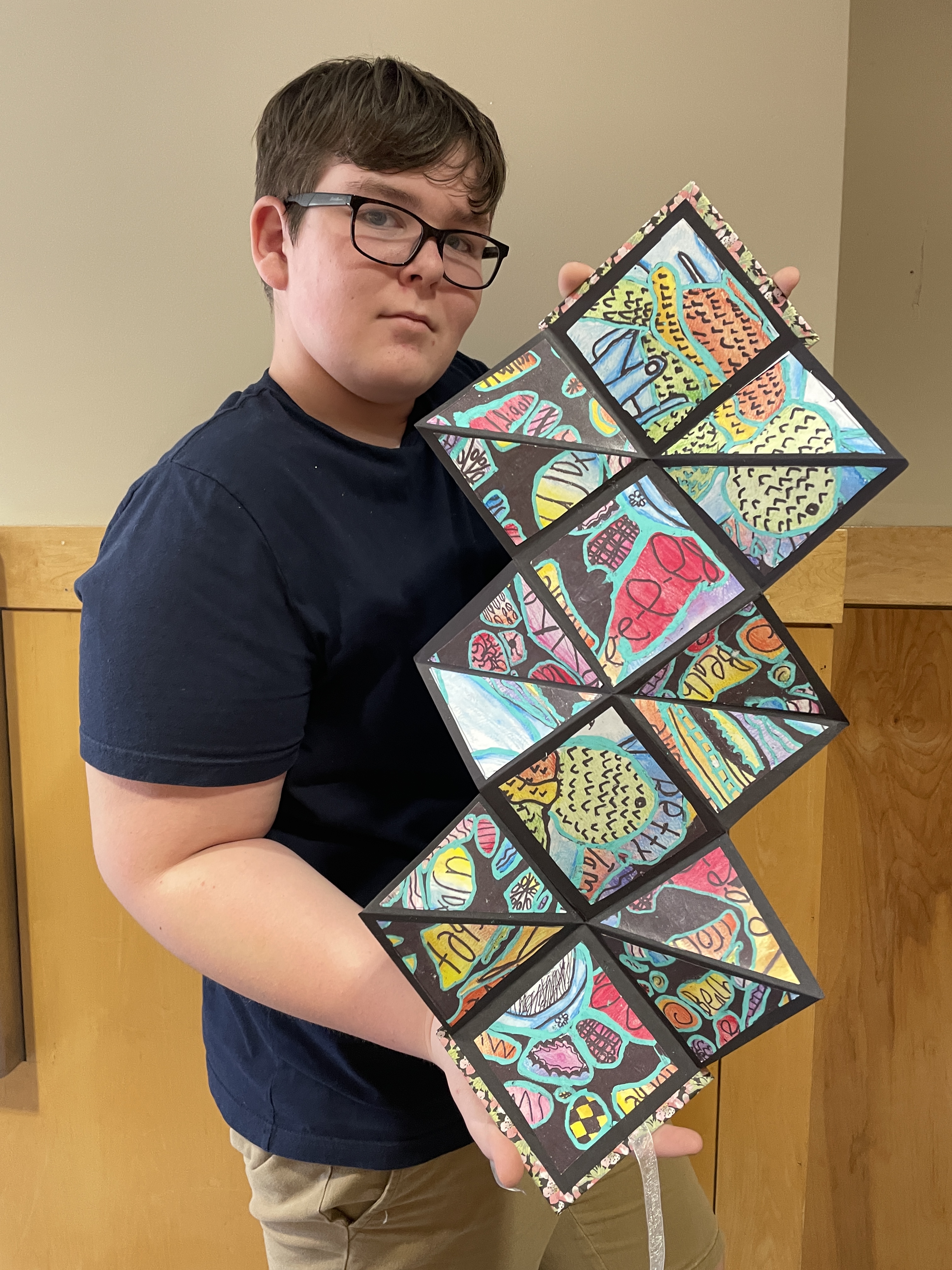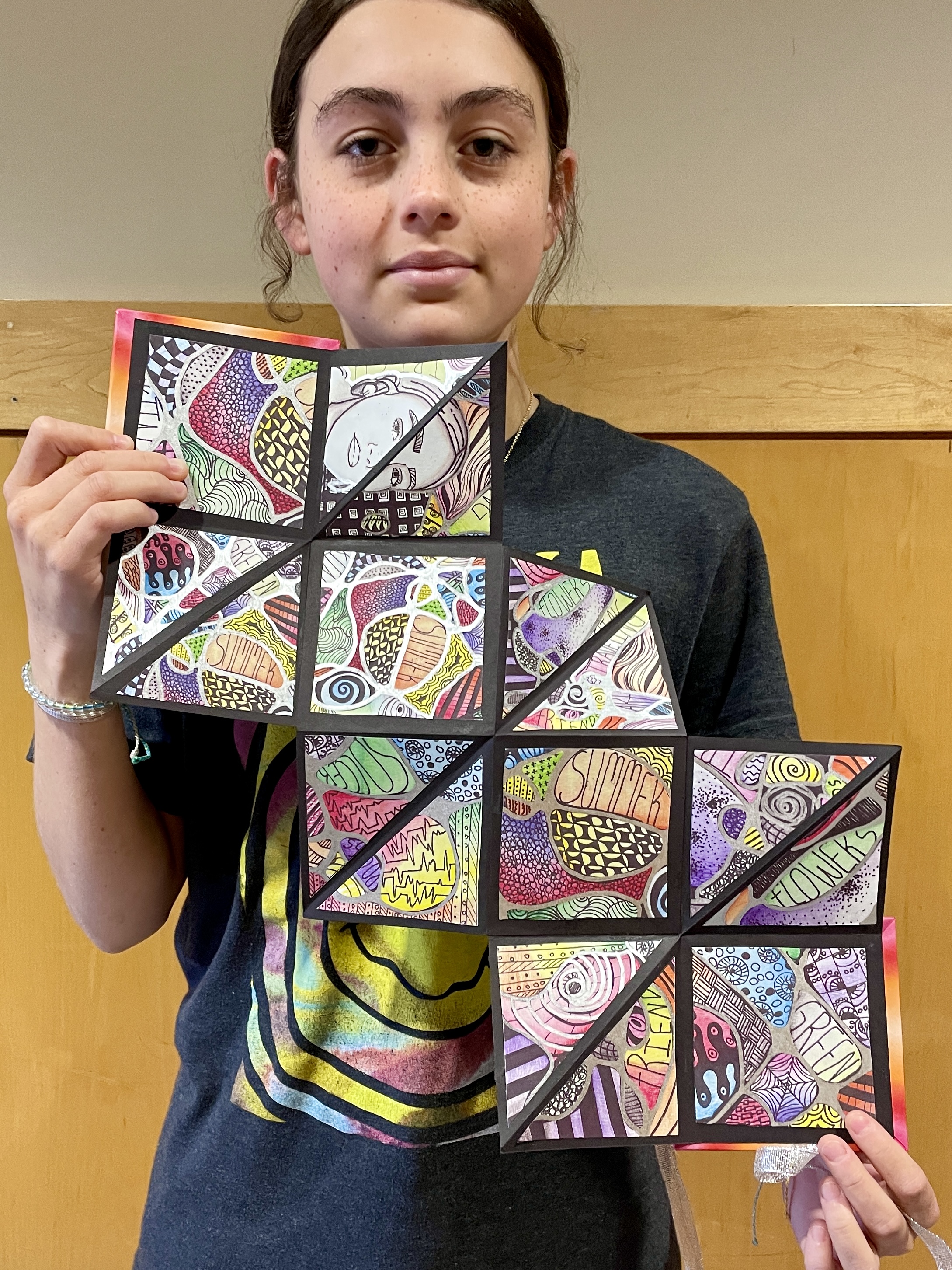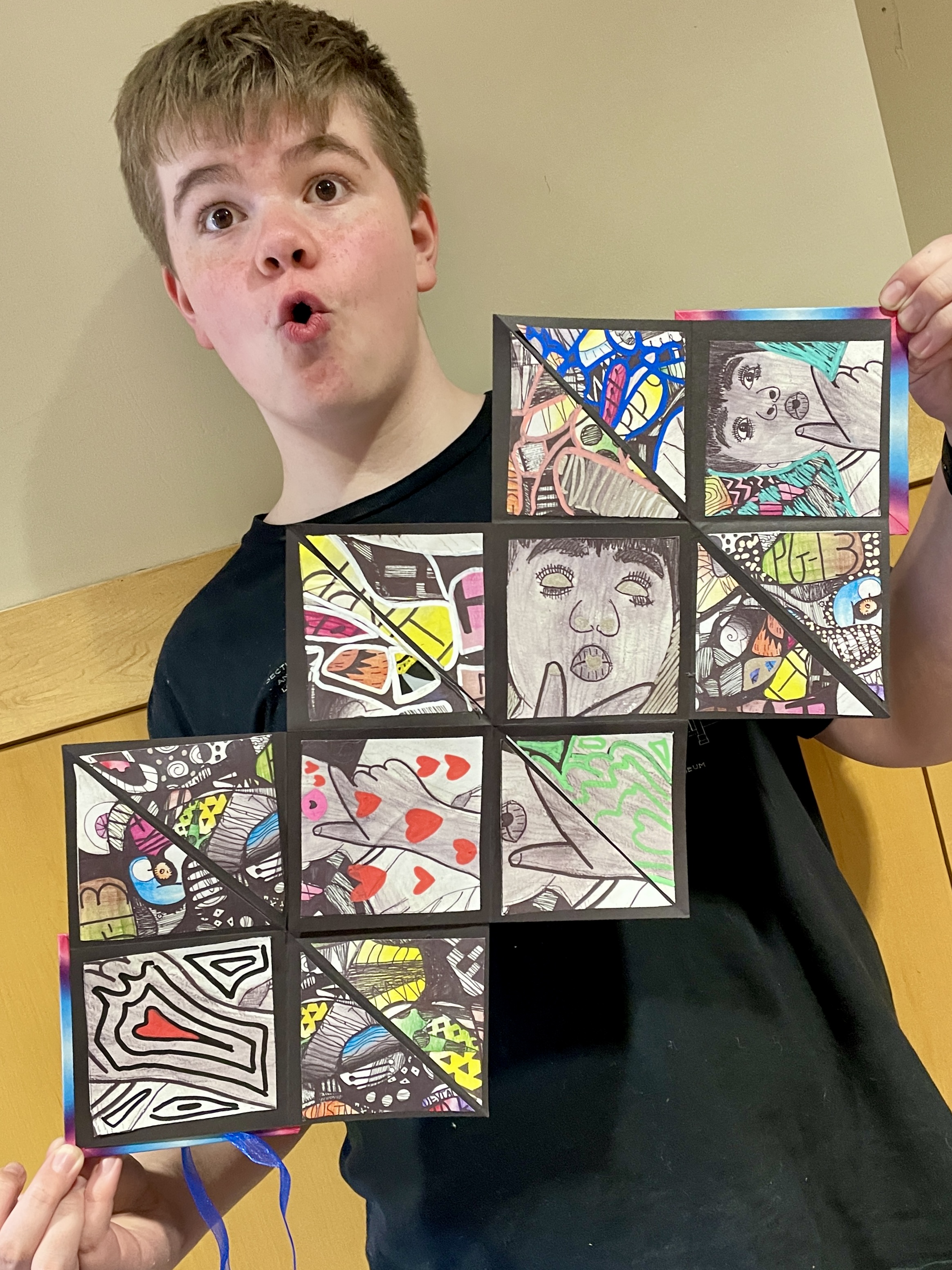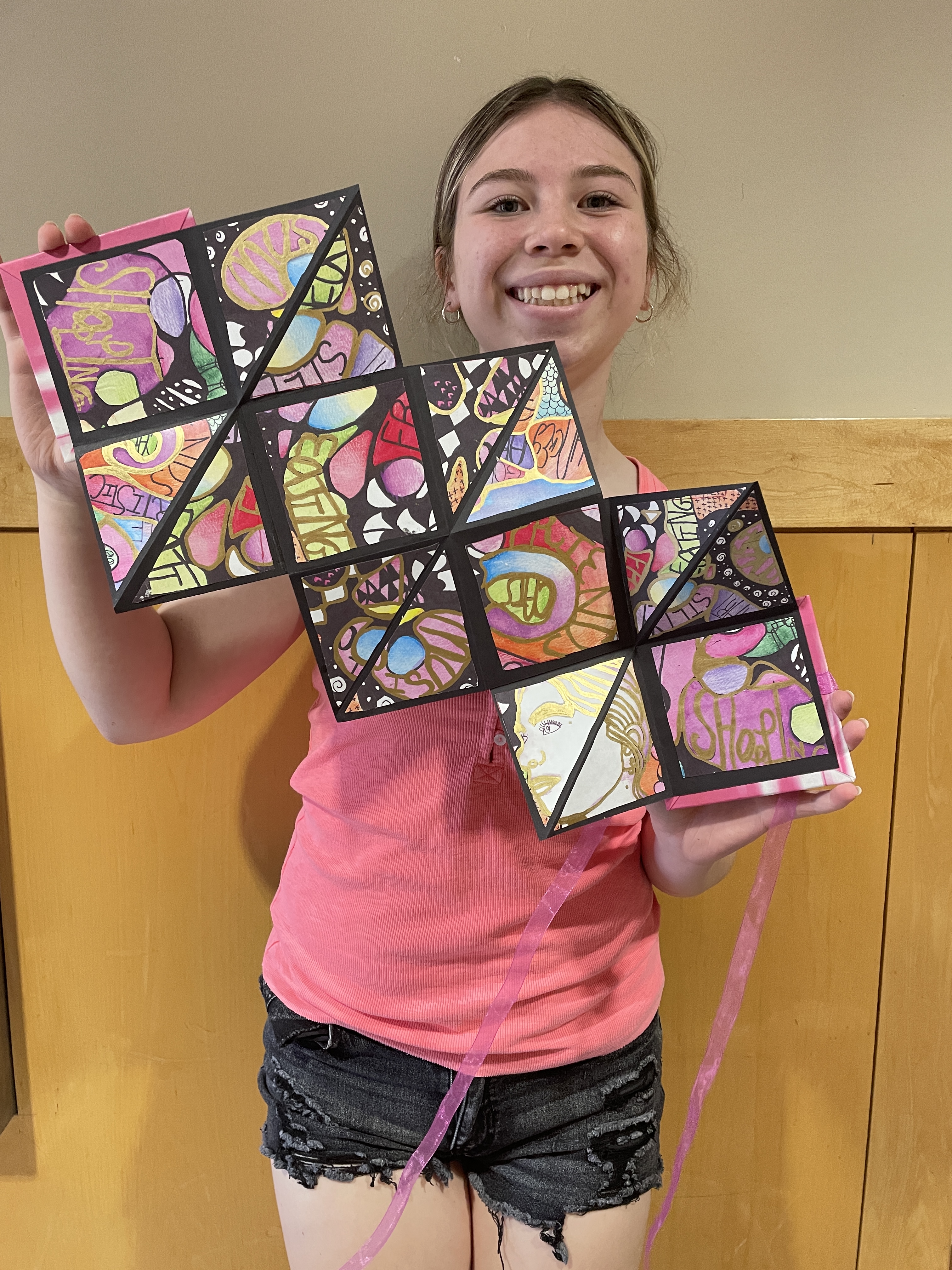 We got a bonus project out of these amazing Neurographic Self Portraits! No, we didn’t cut up our beautiful artwork, but I made several color photocopies of each student’s piece, and they selected their favorite parts to crop, embellish, and turn into the pages of these awesome Explosion Books.