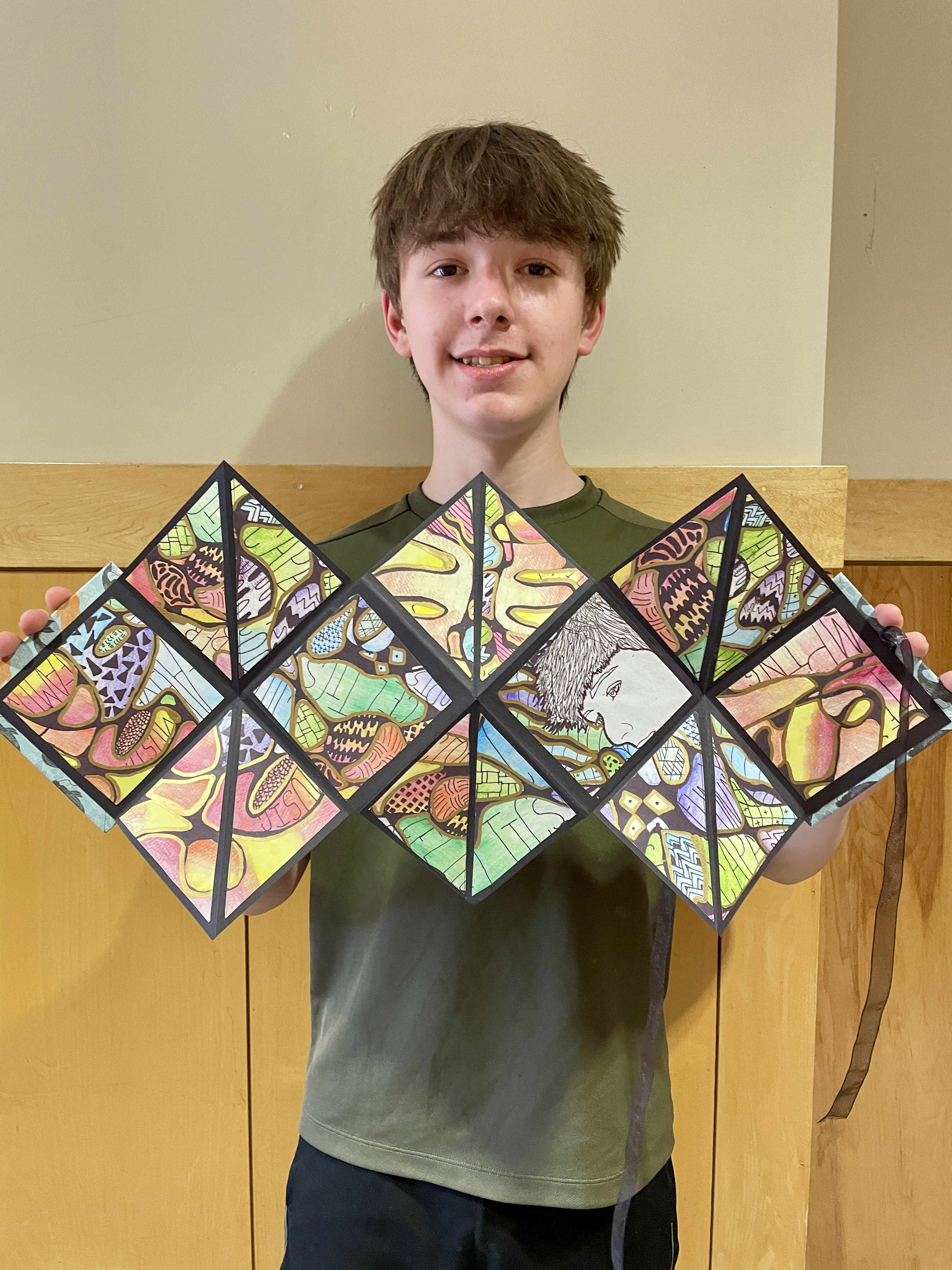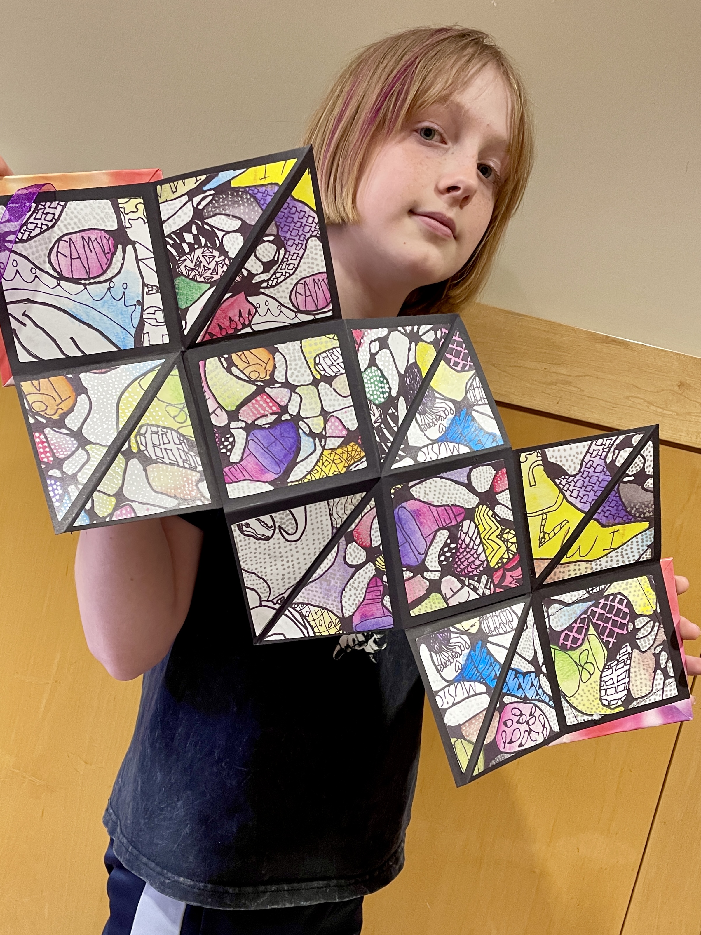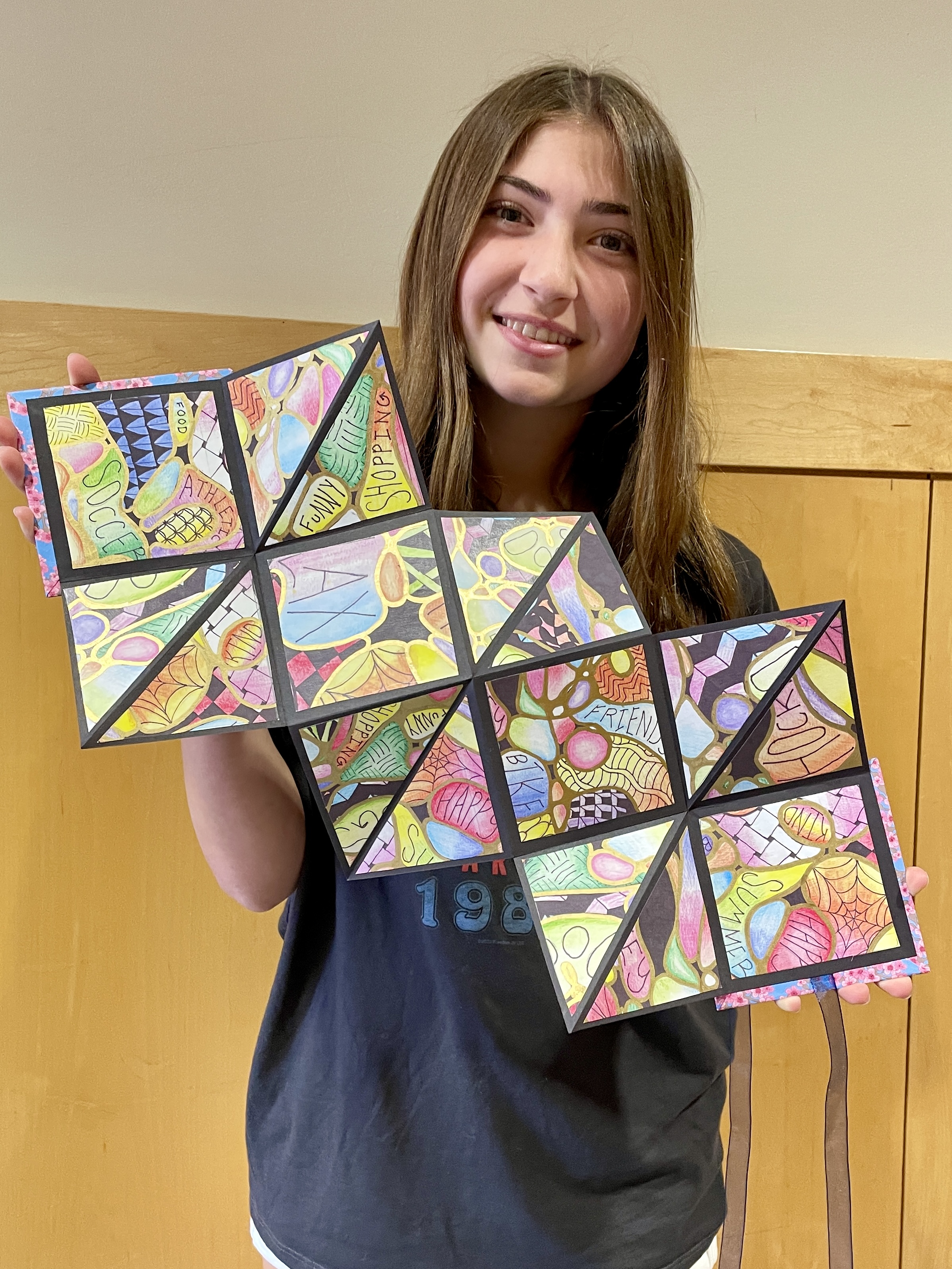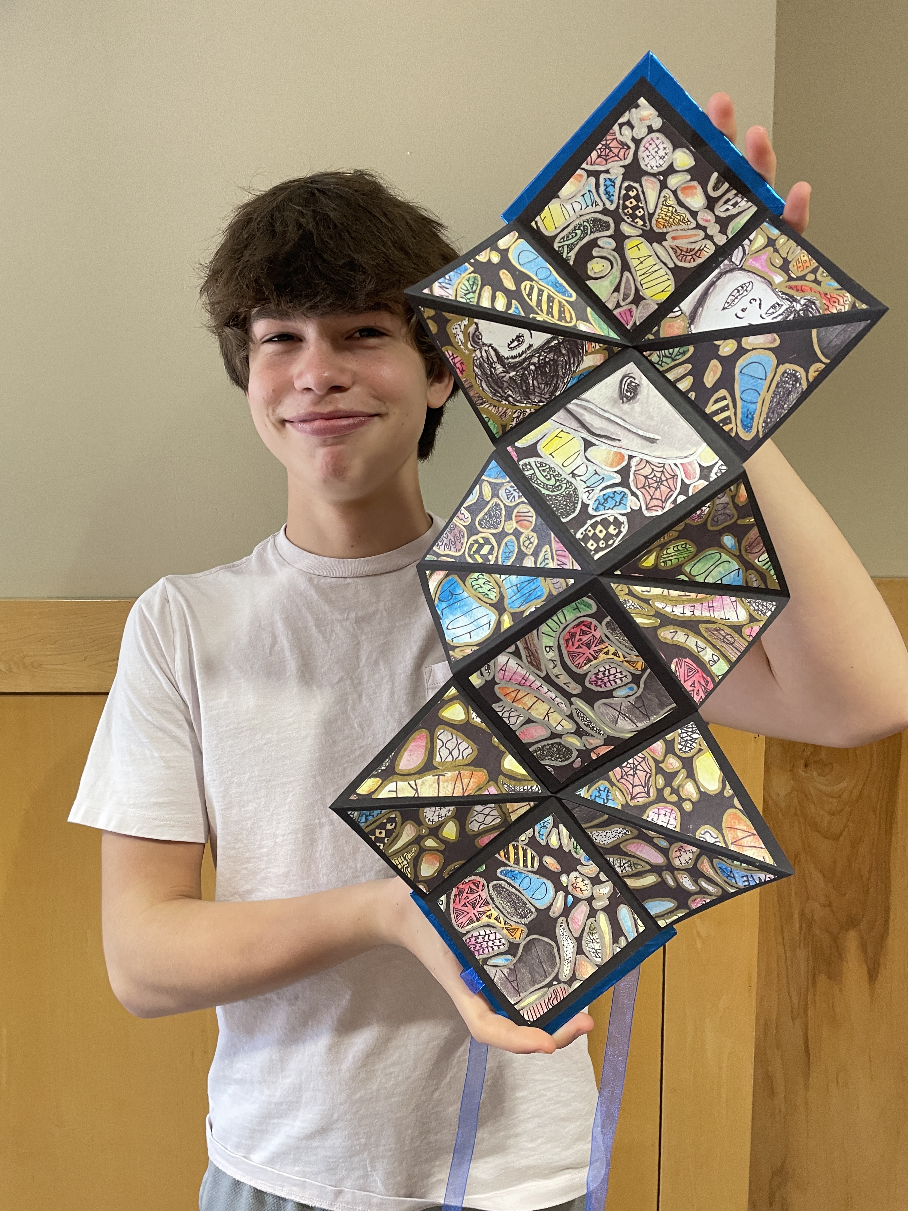 We got a bonus project out of these amazing Neurographic Self Portraits! No, we didn’t cut up our beautiful artwork, but I made several color photocopies of each student’s piece, and they selected their favorite parts to crop, embellish, and turn into the pages of these awesome Explosion Books.