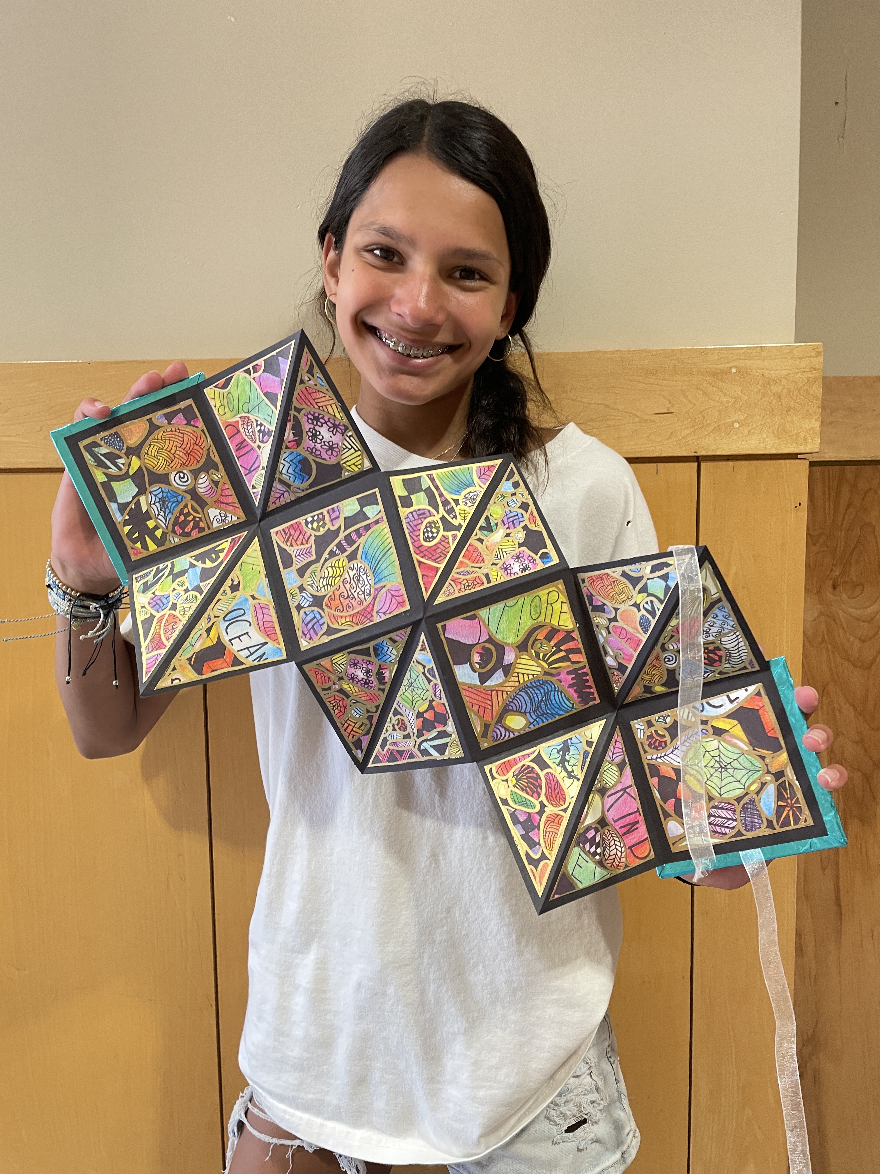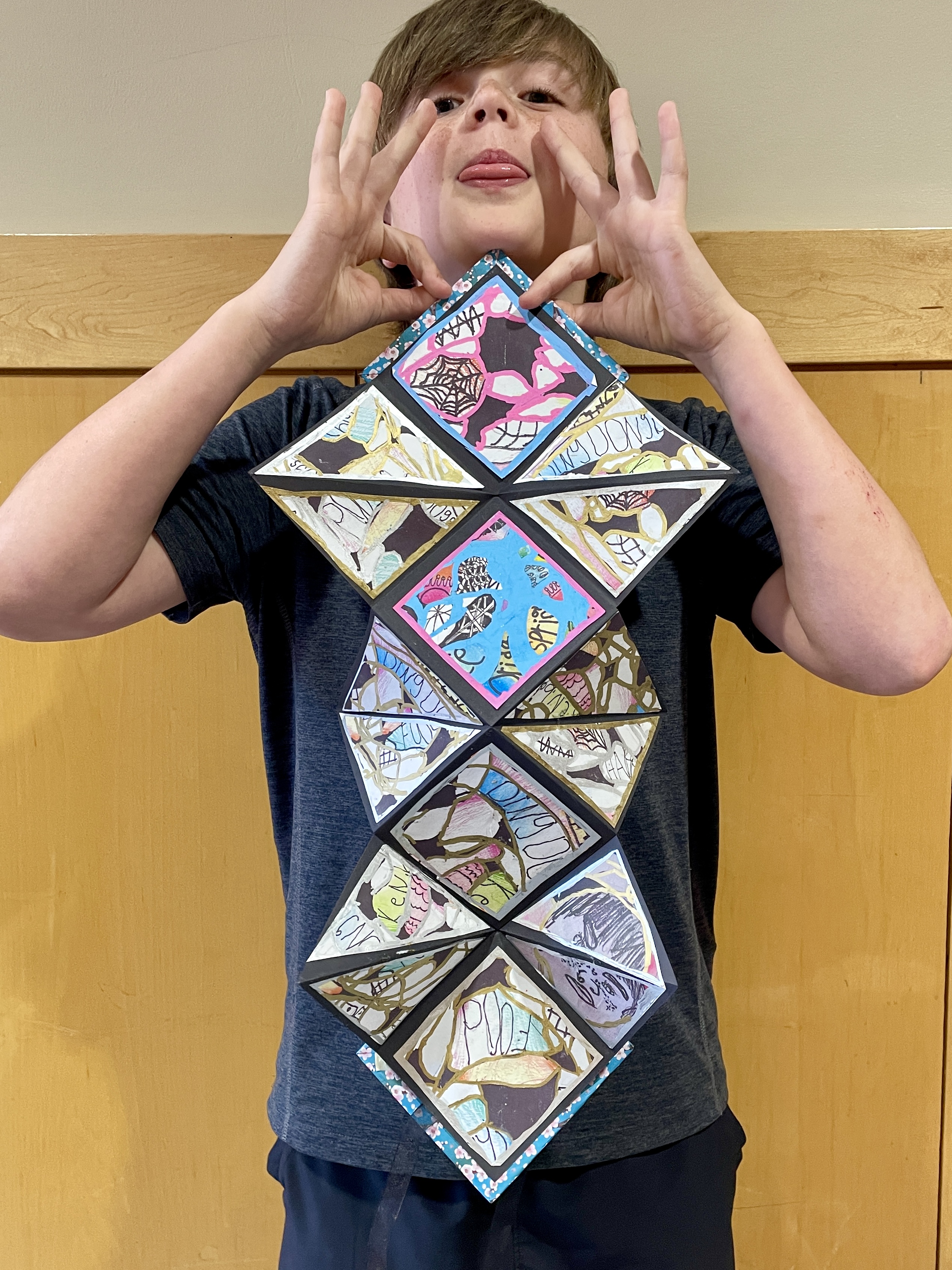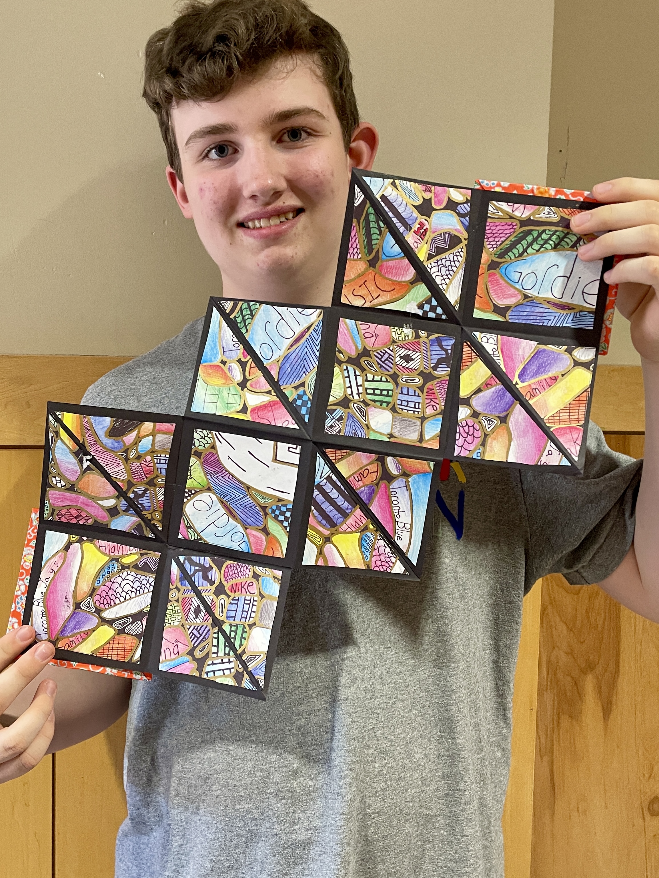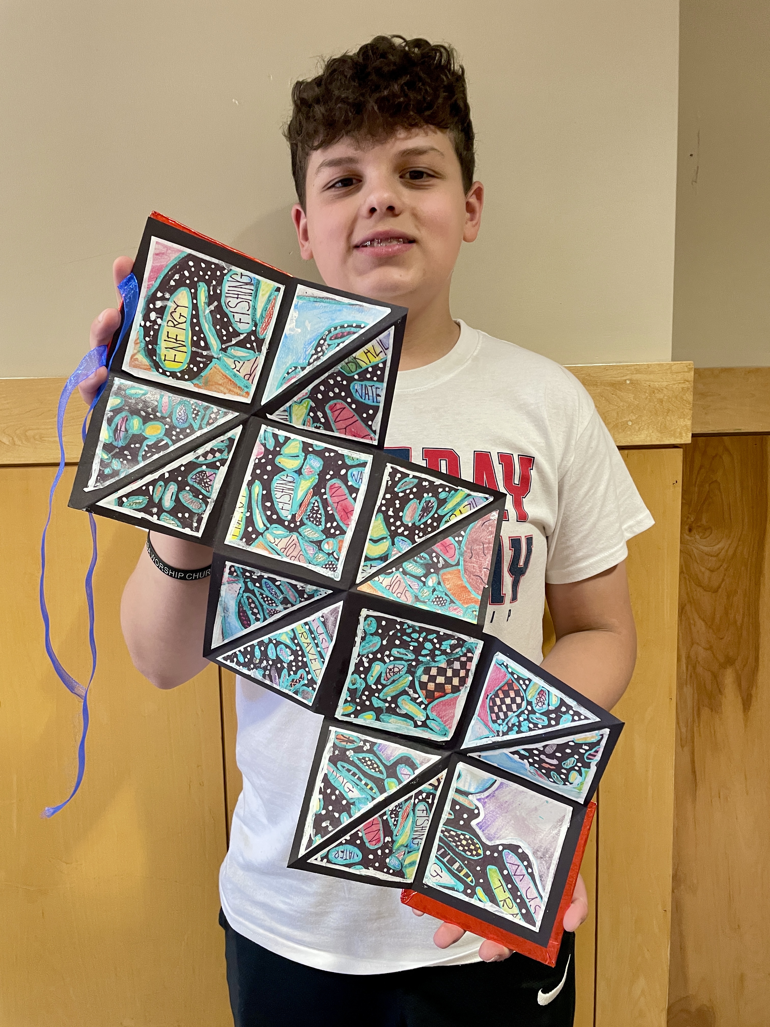 We got a bonus project out of these amazing Neurographic Self Portraits! No, we didn’t cut up our beautiful artwork, but I made several color photocopies of each student’s piece, and they selected their favorite parts to crop, embellish, and turn into the pages of these awesome Explosion Books.