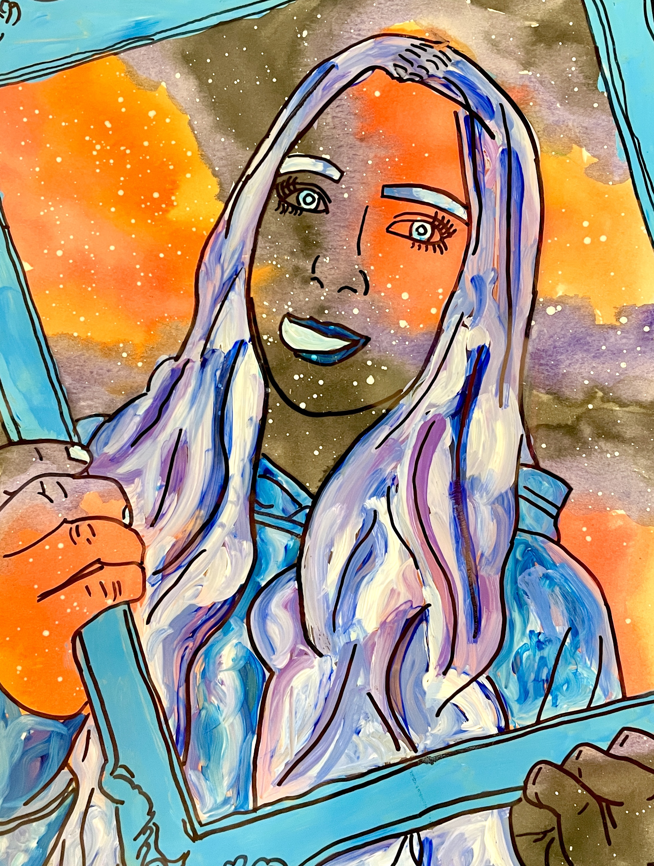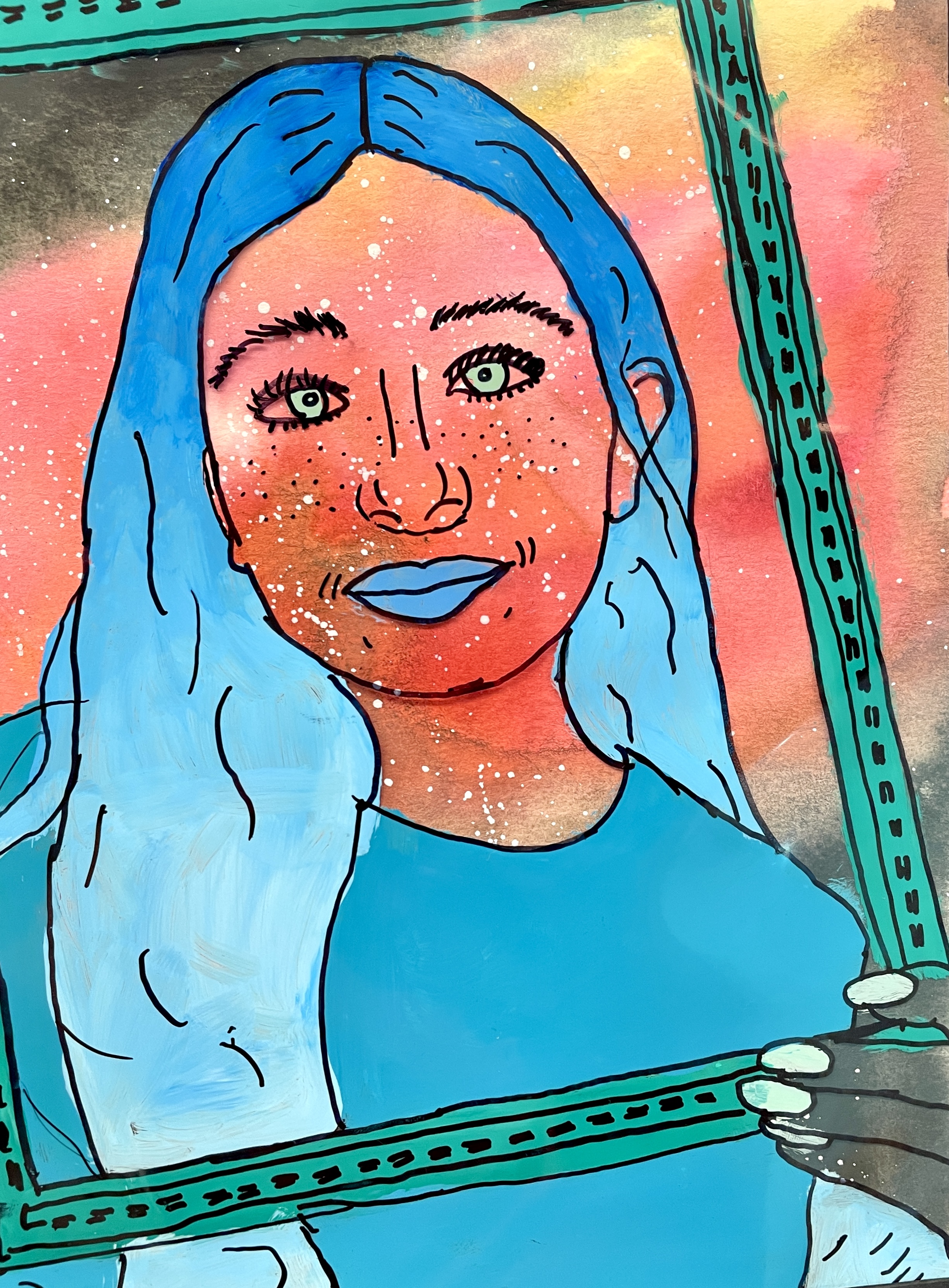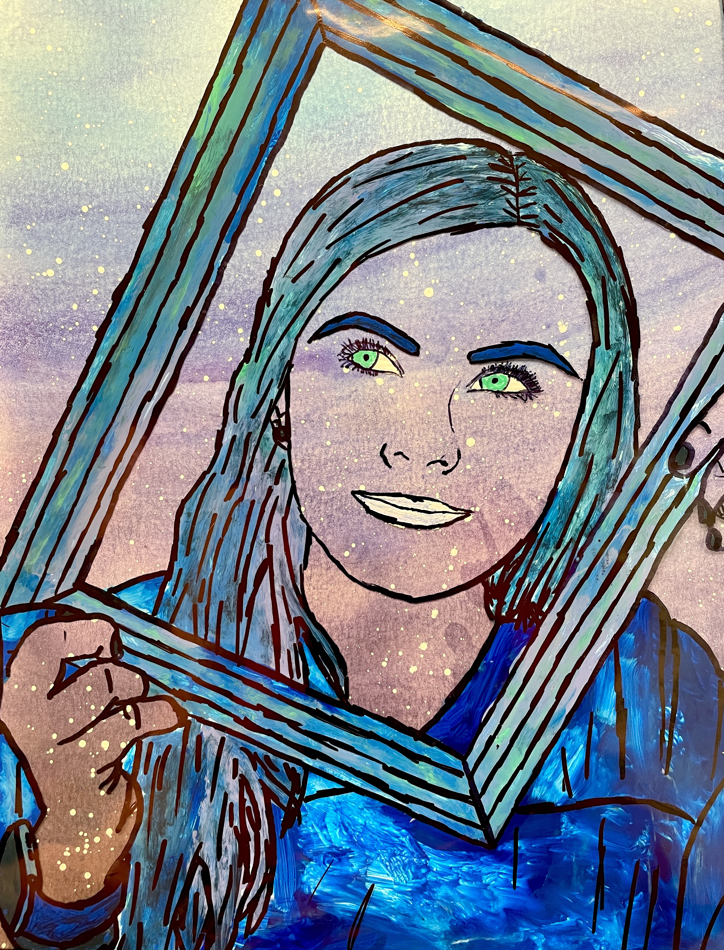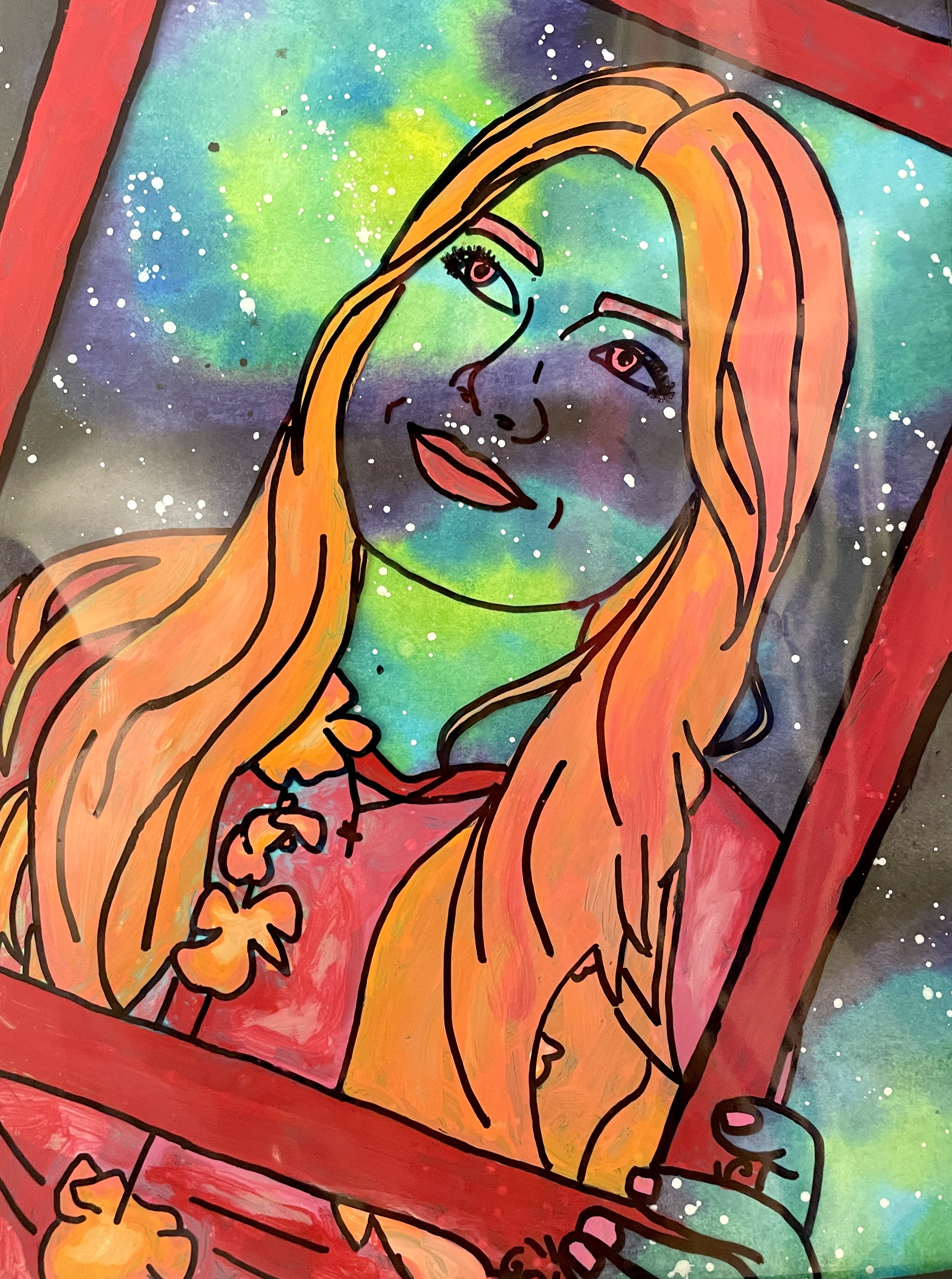 We then painted the back of the acetate using acrylic paint. Students had to select an analogous color scheme thoughtfully as well as apply their paint in directional marks to best accentuate the flow of hair and clothing. Because they painted the reverse side, students had to think carefully about the fact that the first strokes of paint applied are what is most visible once the painting is done, dried, and flipped back over.