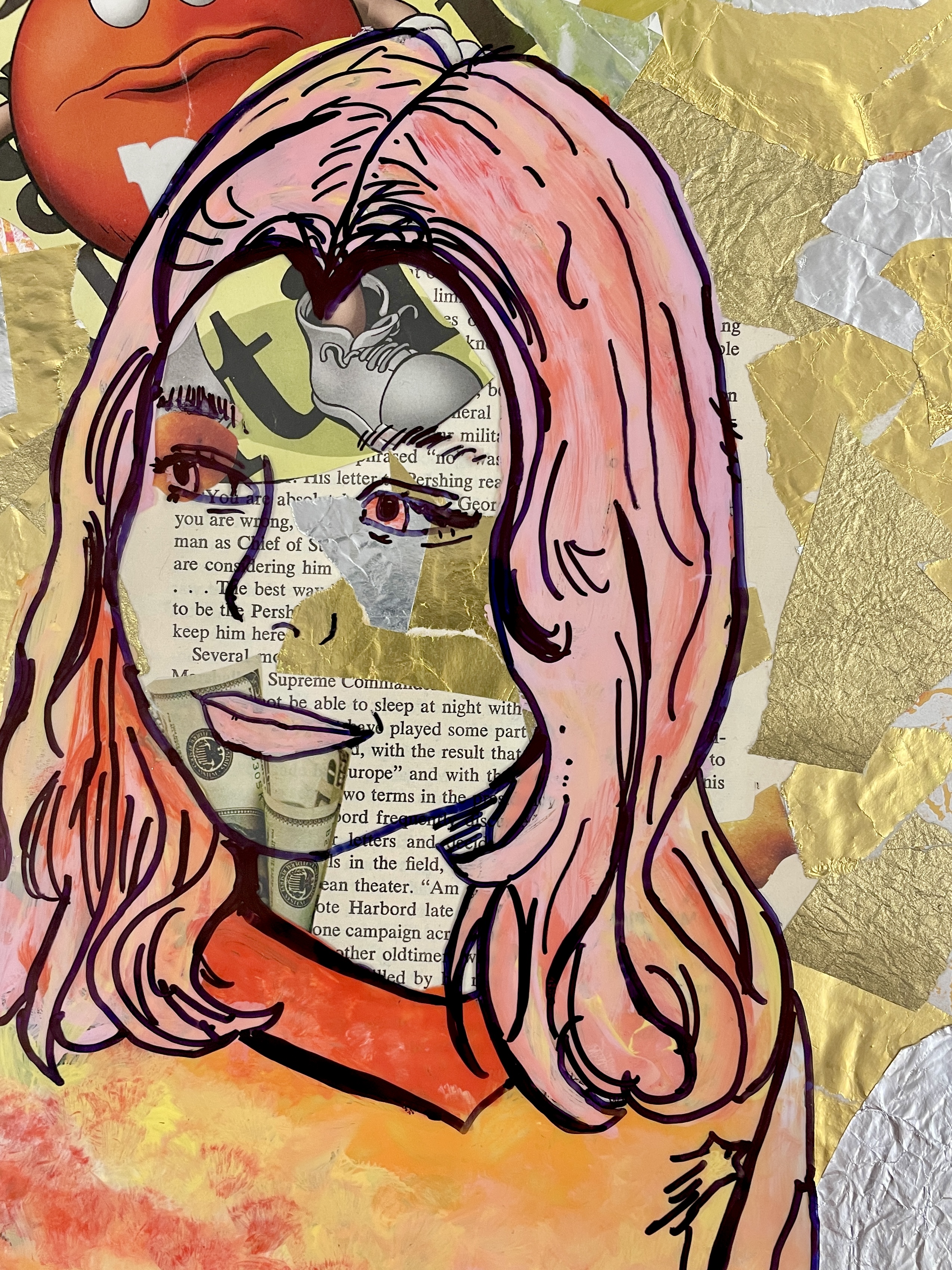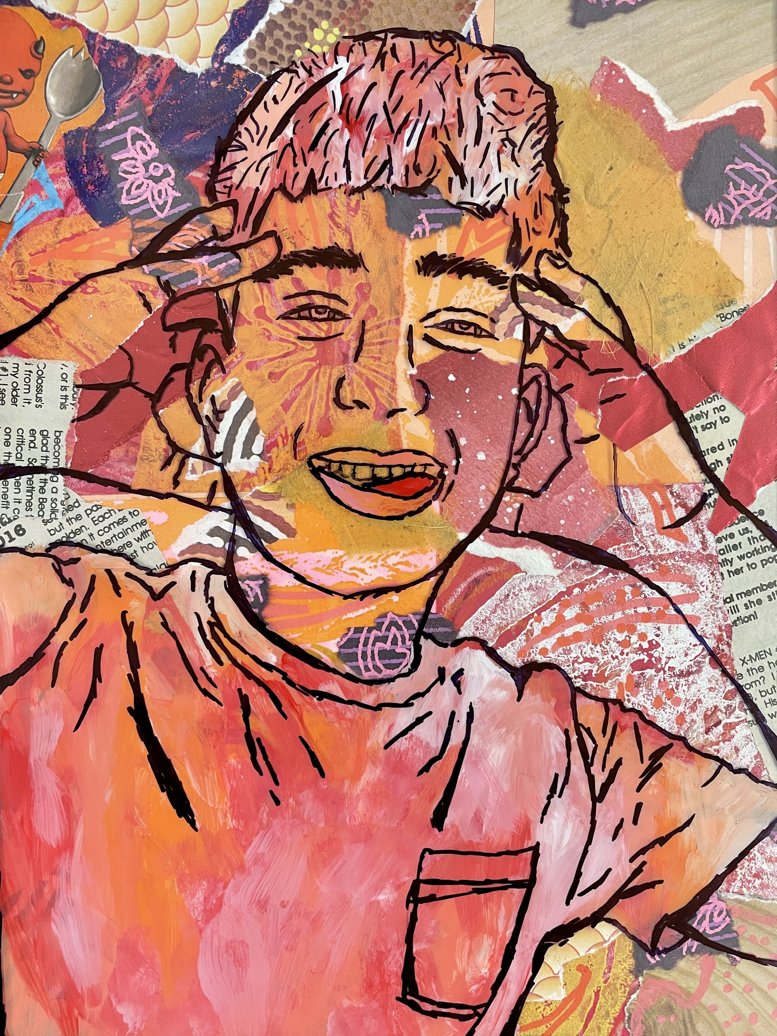 Whew! Not done yet! Just did this lesson again, this time using original collages as the background! Students had recently completed an extensive printmaking project and used leftover prints as the basis for their collage. In some cases, they completely covered their original prints, and in others, allowed portions of the prints to be visible. I provided various patterned and textured papers as fodder for these collages, as well as old comic books, magazines, and books. I Love the layered look on these!