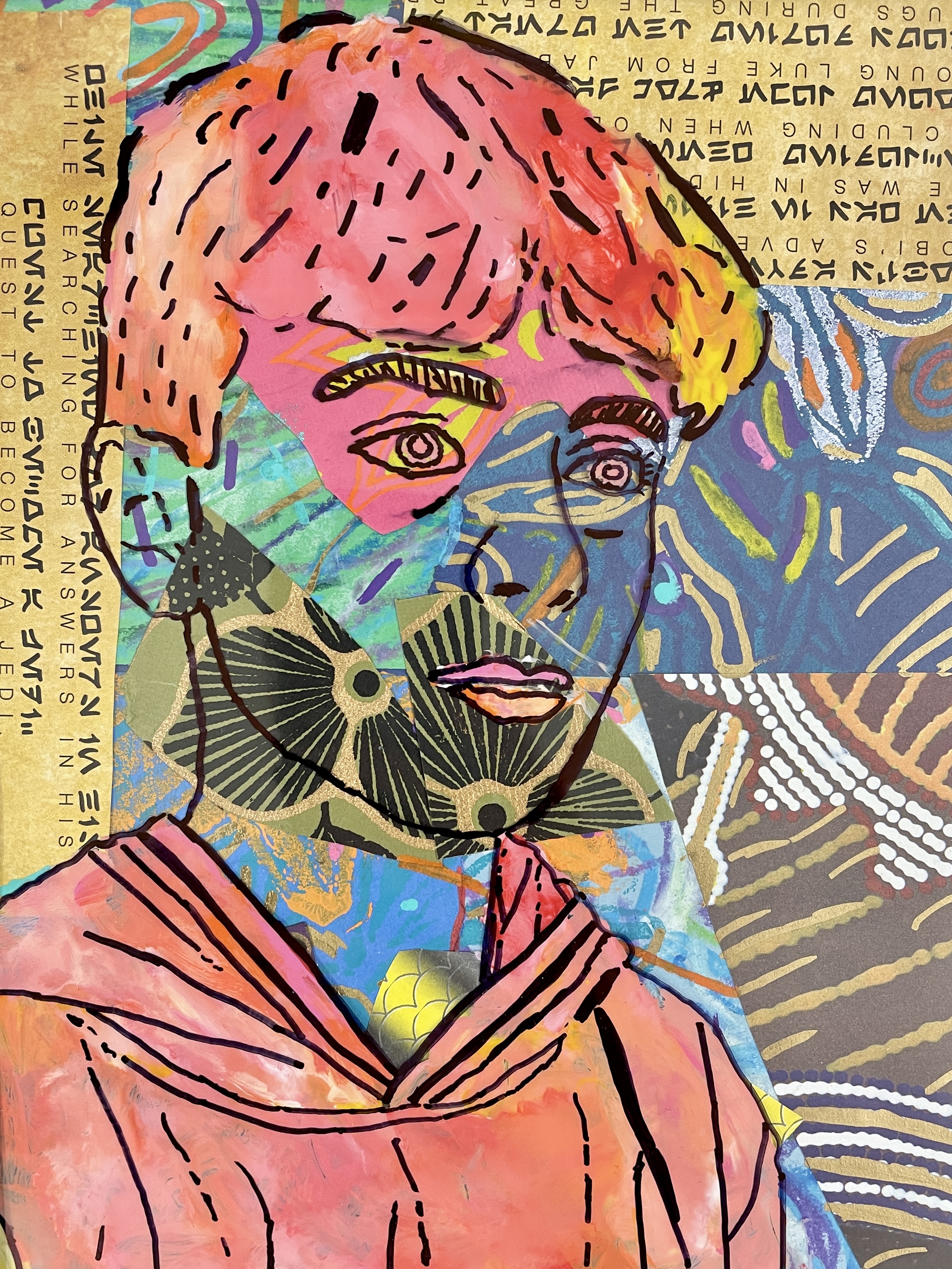 Students had the option of a full color or grey scale photocopy, or a monochromatic copy in a single hue of their choosing. (I am lucky that our school as color copiers with some pretty advanced features!) You’ll notice that for these portraits, most students painted their faces. I found that the strong line elements and patterns of the Neurographic Art made it difficult to see the facial features when they remained transparent… For subtler background options, you may not need to have students paint their skin.