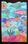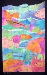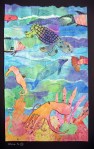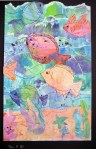 Students began this lesson with a week of watercolor painting. We learned four painting techniques and each student created an assortment of painted papers in each style using warm, cool and “free” color schemes. We then cut, tore and drew on these papers to create an ocean scene with fish, coral, and other sea life. Each student chose the best examples their painted papers to make their fish with a focus on achieving a contrast of technique and color. There were compositional requirements that also had to be considered, such as showing examples of overlapping and “breaking the edge”, (having a partial or whole fish go off the edge of the paper.) It was also a requirement that each sea creature had to be based on a realistic observation. We used a variety of reference pictures and books on sea life to help us with that goal!